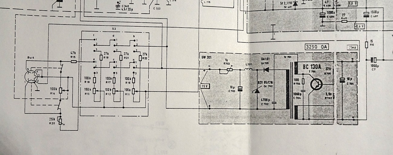 Der Fehler liegt in der Tat auf dem Spannungswandlerboard GW301. Denn dort kommen 7,5v an, aber am Ausgang (Zw. Punkt c und d) aber keine Spannung mehr. Gleichwohl haben beide Punkte c un dd jeweis 7,5V nach Masse. Auch beide Dioden haben an allen Anschlüssen die 7,5V anliegen. Ich hätte jetzt vermutet, dass bei defektem BC130 auf der Sekundärseite des Trafos gar keine Spannung mehr anliegt. Ich denke, der Transistor ist hin, ich versuche aber jetzt nochmal alle Bauteile - wenn möglich - durchzumessen...