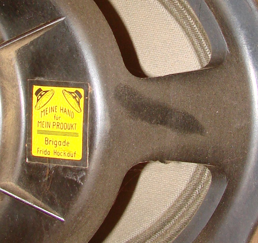 das "Schweben" ist halt die Magie sozialistischer Produktionsweise nein, wegen des Transports wurden die ca. 30cm langen Füße abgeschraubt und auf dem Foto liegt die Truhe eigentlich auf der Seite und ich habe das Bild gedreht. Der Hängebauch ist die Unterseite. Das Design stammt von Wilhelm Krechlok KG Tonmöbel Luckenwalde. Alles in allem ein Produkt, das dem Klassenfeind Paroli bot. Es atmet noch den Geist der Aufbruchszeit.