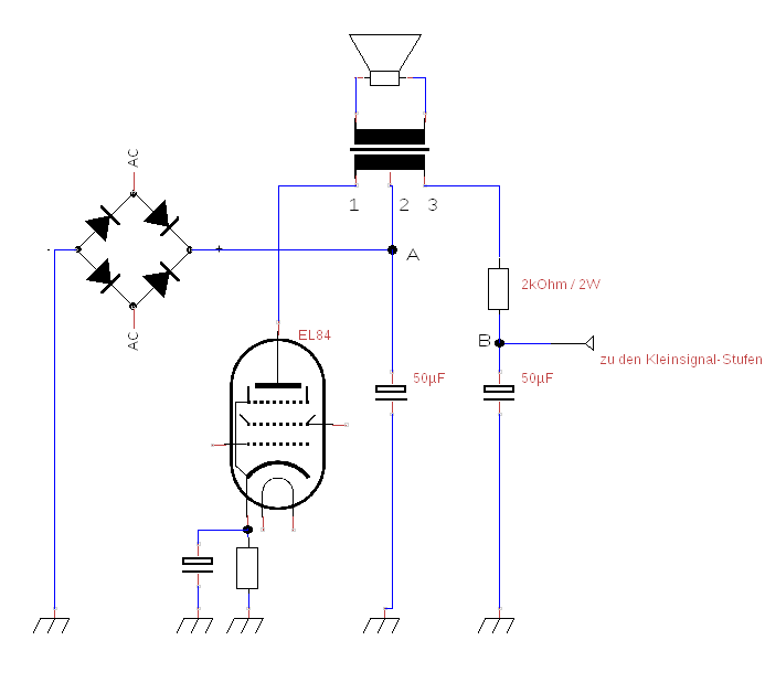 Da der rechte Elko 50µF und der Widerstand 2 kOhm für die Brummspannung einen viel viel kleineren Widerstand darstellt als der Innenwiderstand der EL84, muß die Teilwicklung 2-3 auch viel weniger Windungen haben als die Anodenwicklung 1-2, so dass sich die gegensinnig fließenden Brummanteile auch wirklich auslöschen.