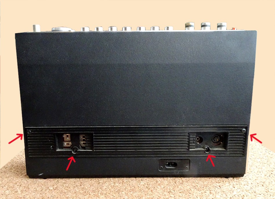 Rote Pfeile auf Oberseite: Sind schon im vorigen Foto gezeigt. Rote Pfeile an der Hinterseite: Die Schrauben sind auf dem Foto nicht zu sehen, befinden sich aber dort weiter hinten.