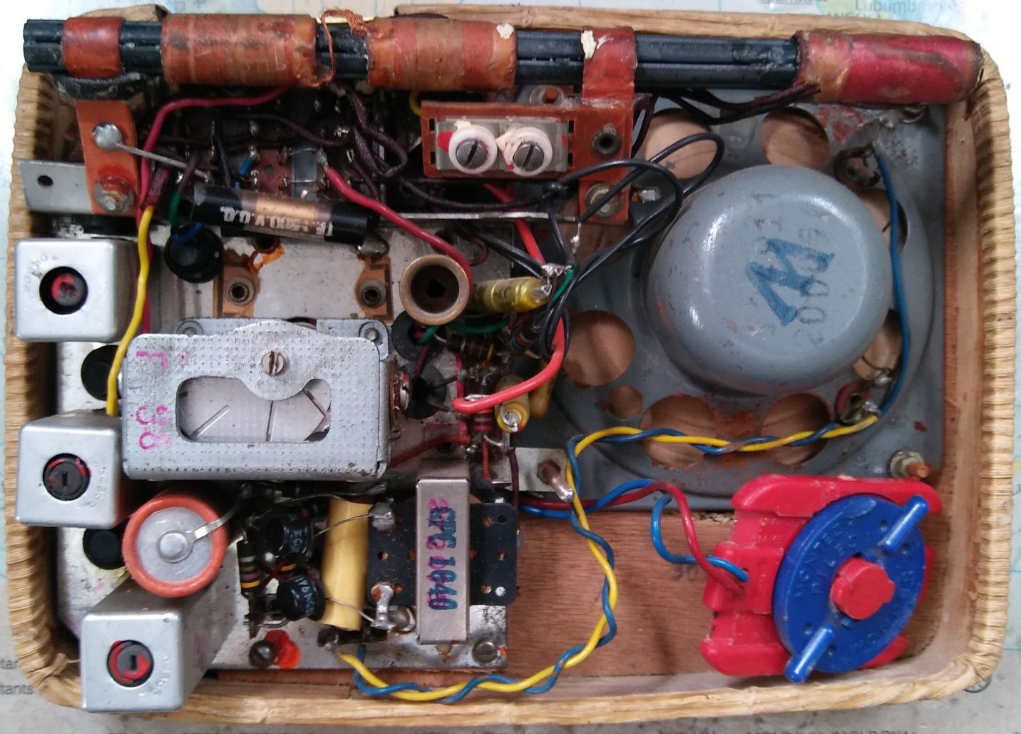 sehr gelungen die Restauration, gefällt mir und dazu ein interessantes Innenleben, welches ich so bei einem Transistorgerät noch nicht gesehen habe. Es zeigt wohl sehr gut die Übergangszeit zwischen dem auslaufenden Röhrenzeitalter und damals moderner Halbleitertechnik. Hier wohl Germanium. Der Aufbau der Teile wie in einem Röhrengerät, es gibt sogar ein kleines Chassis. (Register?) Fehlende Stützpunkte sind mit Lötösen realisiert. Echt interessant.... es gibt sogar noch einen kleinen Luftdrehko.