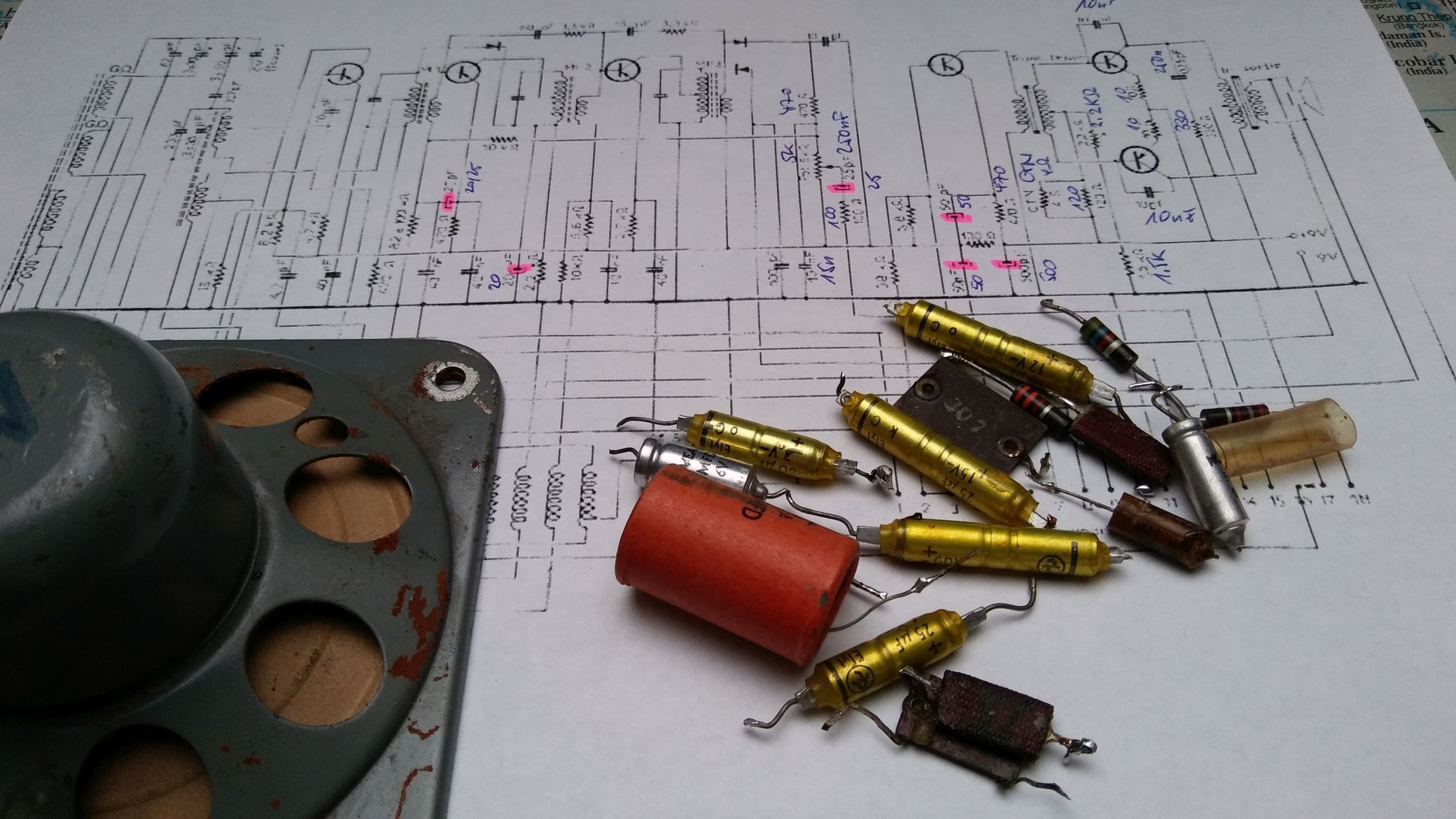 Das Radio enthielt genietete Glimmer-Pertinaxkondensatoren der Werte 230pF, 320pF, 68pF und 15pF (frequenzbestimmend, die kleinen zur Neutralisation der 2-stufigen 472kHz-ZF), die getauscht werden mussten, weil die Kontaktgabe nicht mehr stabil war. Natürlich standen alle Elkos zwischen 25 und 500µF auf dem Austauschprogramm, dann ein paar Abblock-Kondensatoren 40nF, und Festwiderstände, die mehr als 25% zu hochohmig geworden sind. Ich nenne das den Heathkit-Effekt, denn diese bis Ende 60'er Jahre verwendete Bauart wurde in allen Wertbereichen immer hochohmiger. Selbst die Kohleschicht des Lautstärkepotis habe ich mit 6,6 kOhm ermittelt, obwohl es 5k Ohm haben sollte. Hier war ein Austausch natürlich nicht erforderlich.