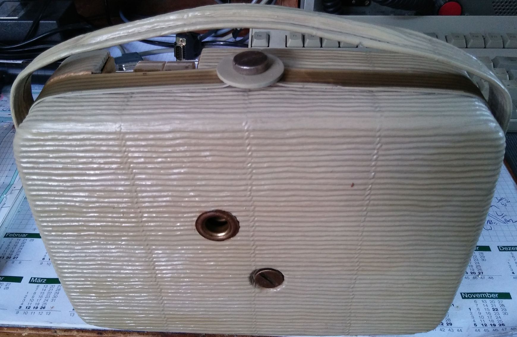 Man beachte auch die kleine Bassreflexöffnung auf der Rückseite. Der Rundlautsprecher von 10cm Durchmesser verleit dem Gerät eine sehr angenehme Audioqualität. Von 6 Germanium- Transistoren und einer Ferritantenne darf man natürlich nicht die Empfindlichkeit der 20 Jahre jüngeren Transistorgeräte erwarten.