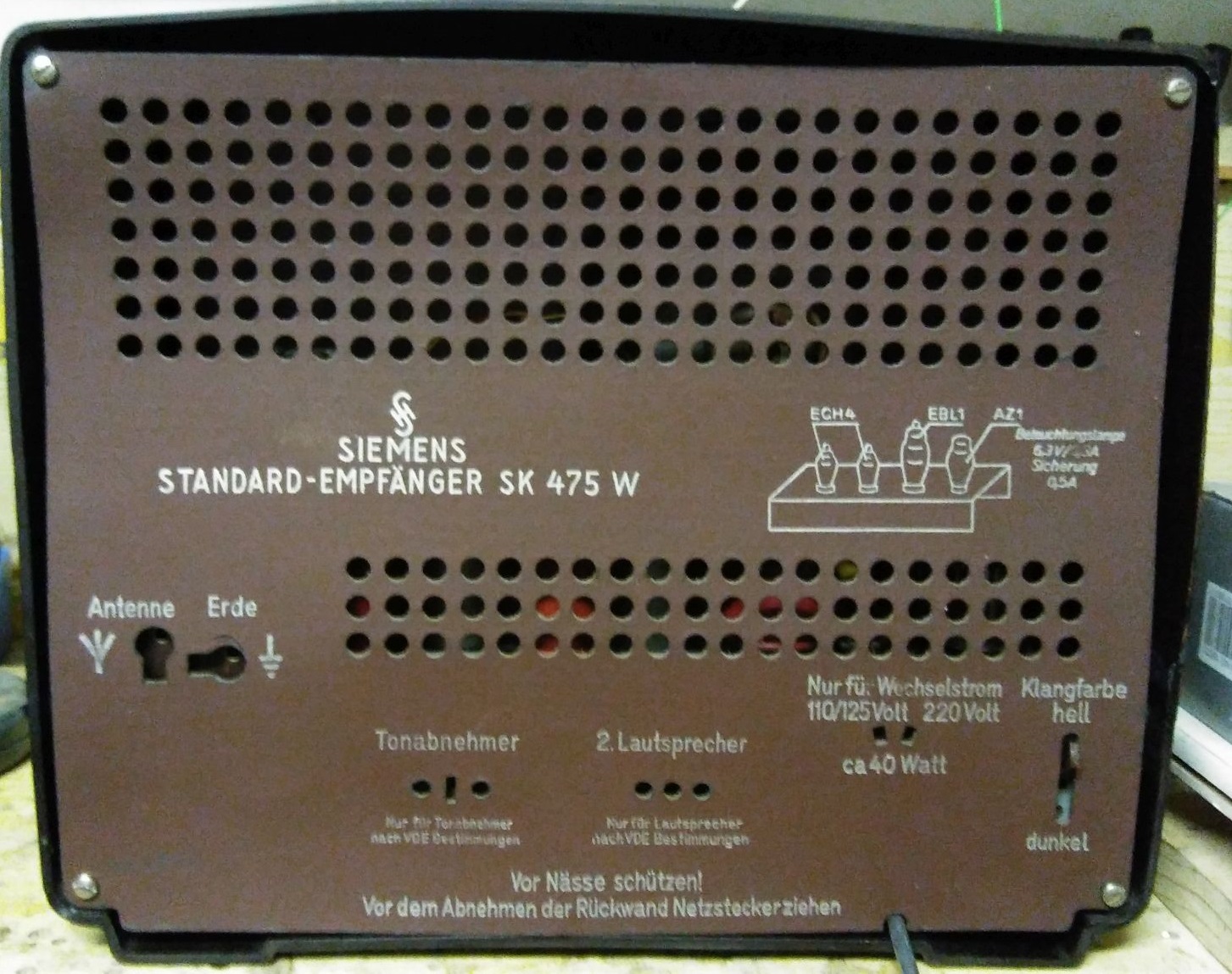 die Hundstage mit Temperaturen bis 37°C im Dachgeschoss haben mich täglich in den Keller getrieben. Neben der Restaurierung eines DKE38 (*(N)*chnauze) und eines Volksempfängers VE301dyn W stand auch ein Nachkriegs-Standardsuper SK475W aus der britischen Zone von Siemens auf dem Programm.