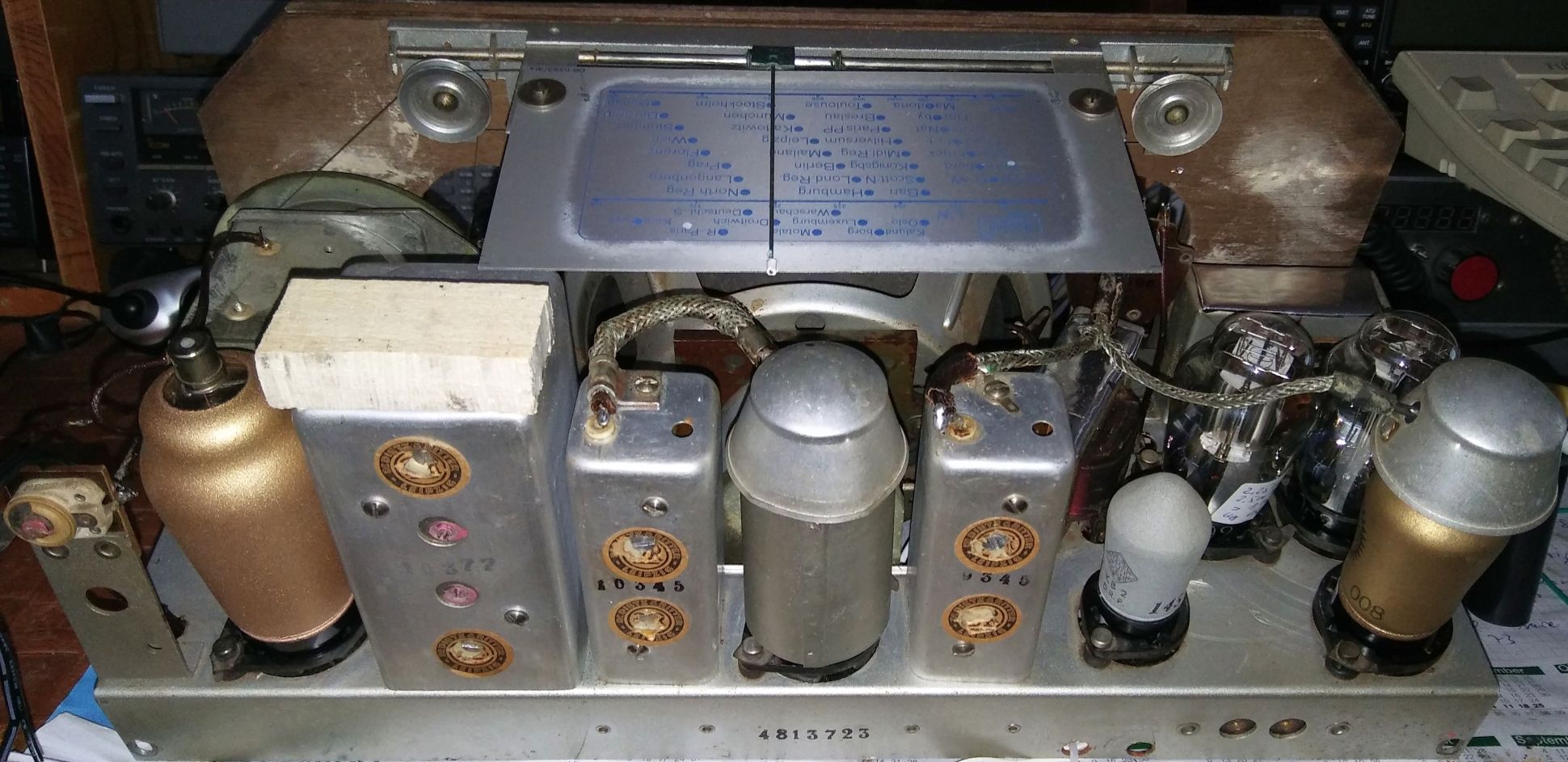 Die Restaurierung dieses Radios erforderte einige Geduld. Auf den üblichen Tausch der Teerkondensatoren, die sich in ihrem Wert fast verdoppelt haben und nur noch mangelnde Isolationswiderstände aufwiesen, und der beiden Elkos gehe ich nicht weiter ein. Ich war erstaunt, dass jemand in dem aus dem Jahr 1938 stammenden Gerät bereits 10 bis 15 Jahre später die Elkos - mit Baujahr 1948 - tauschen musste. Original waren Typen mit quadratischem Querschnitt und gelber Papierummantelung verbaut, die ich zuvor nie gesehen habe.