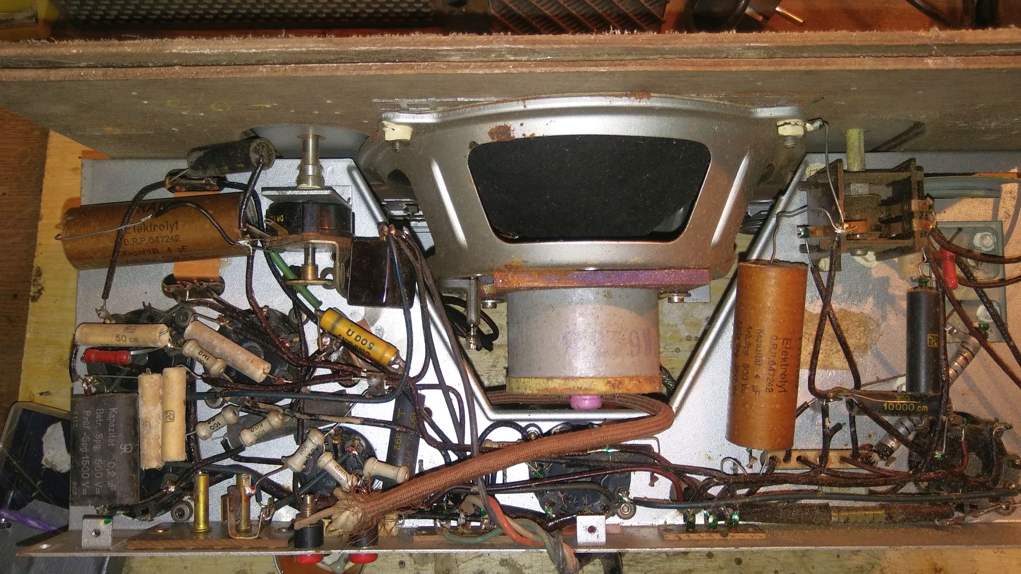 Das mit Kunstleder bezogene Holzgehäuse zeigte Wurmbefall und war am Platz der offenen Bleibatterie durch Säure beschädigt. Wenn jemand diese kleinen, scharfkantigen 1 mm Löcher entdeckt, dem kann ich nur raten, sie mit Holzkit zuzuschmieren und nach 48 Stunden nach- zusehen, ob sich etwas verändert hat. Meistens ja, und hier hilft nur eine Wärmebehandlung: Eine Stunde mit 55 Grad oder 2,5 Stunden mit minimal 48 Grad Celsius. In die Sonne legen nützt nichts, die Tierchen krabbeln in ihren Kanälen an die kälteste Stelle und haben so eine Überlebenschance. Ich habe den Backofen mit Umlufteinstellung bei 70 Grad gewählt. Um Holzrissen vorzubeugen wäre aber die feuchte Sauna besser. Auch die Holzfrontplatte zeigte Wurmbefall, sodass das ganze Radiochassis für 2 Stunden bei 70°C in den Backofen ging. Dadurch setzte sich der Friktions-Drehkoantrieb bombenfest, konnte aber nach Herausdrehen der "Bremsnippelschraube" und Einspritzen von Kriechöl wieder flott gemacht werden.