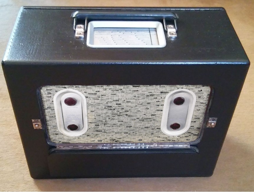 das hier gezeigte Kofferradio "Körting Tourist KS6230B" aus den Jahren 1937 und 1938 ähnelt im Aufbau dem "Nora K69" oder "Braun BKS36 / 237" und ist mit den Abmessungen 42 x 34 x 19 cm und 15 kg (ohne Batterien 9,5 kg) ein echtes Schwergewicht und ein "echtes" Kofferradio. Im Gegensatz zum "Olympiakoffer DOK37" ist es ein richtiger Superhet mit guter Regelung.