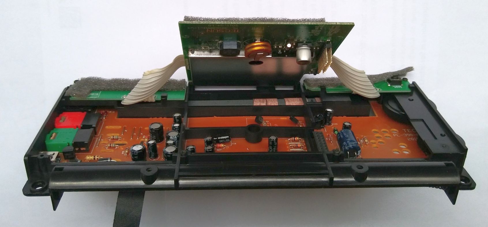 Vor Aufgabe einer Bestellung mit einer Lieferzeit von mindestens 5 Wochen kam ich auf die Idee, die Lautsprecher abzulöten. Hierbei normalisierte sich die Stromaufnahme und die Audio war in einem angeschlossenen Kopfhörer laut und verzerrungsfrei zu hören. Nach einer weiteren Demontage der Platine (es sind nur sämtliche sichtbaren Schrauben zu lösen) war der Zugang zu den beiden 220µF Koppel-Elkos zu den Lautsprechern möglich. Nach Austausch dieser Elkos lief das Gerät wieder einwandfrei.