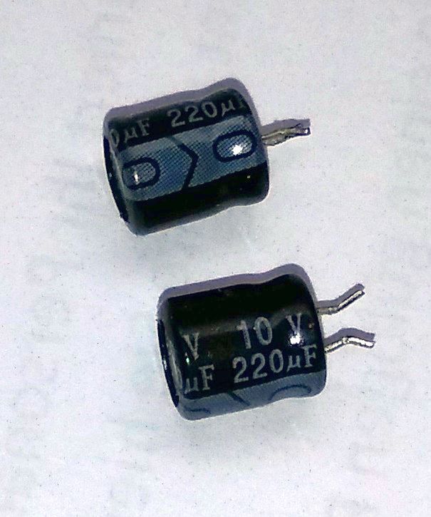 ja, die Koppel-Elkos zu den Lautsprechern waren beide sehr niederohmig geworden. Am IC-Ausgang liegt fast die ganze Betriebsspannung von 3V an. Was ich nicht verstehe ist, dass es beide Elkos erwischt hat. Der baugleiche Abblock-Elko war noch in Ordnung. Die Elkos haben einen Durchmesser von 5mm, Bauhöhe 7mm, Spannung 10V und Temperatur 105°C. Scheinbar sind die Typen allergisch gegen NF. Ich habe 25V-Typen eingesetzt, die ich natürlich liegend plazieren musste. Das NF-IC ist mit 2x 115mW NF-Output angegeben. Die Lautsprecher sind 0,2W-Typen.