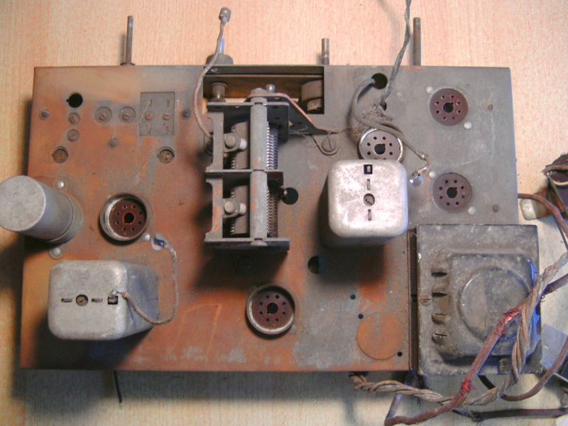 Es gab vom Belmont 570 zwei Ausführungen. Einmal mit Tastenaggregat und eine mit Stufendrehschalter. Letzterer war etwas billiger, den hab ich. Ein schnelles Foto vom Gehäuse zeigt das die Kanten an der Seite abgerundet sind und an der linken Seite ist der Transportschaden. Als erstes wurde das Gehäuse wieder zusammen Geleimt. Jetzt wird der alte Lack mit Aceton und Schleifpapier entfernt. Das Chassis ist schon fast entrostet mit Entroster Gel und Flüssig (Phosphorsäure). Da der LS kaputt ist und die Feldspule auch werde ich die Gleichrichter - Siebkette neu aufbauen. Statt einer 5Y3G eine GZ 34 mit L Eingang, eine 10 H Drossel ist vorhanden, die Elkos auch. Sorge macht mir der AÜ den ich entrosteten musste, aber auch hier ist als Plan B ein 7 K AÜ unterwegs. Für den LS dachte ich an einen neuen Celestion PA 8", kommt auch aus England. Kann nicht immer stringent am Projekt bleiben, noch muss ich arbeiten. :''}); MFG Nobby
