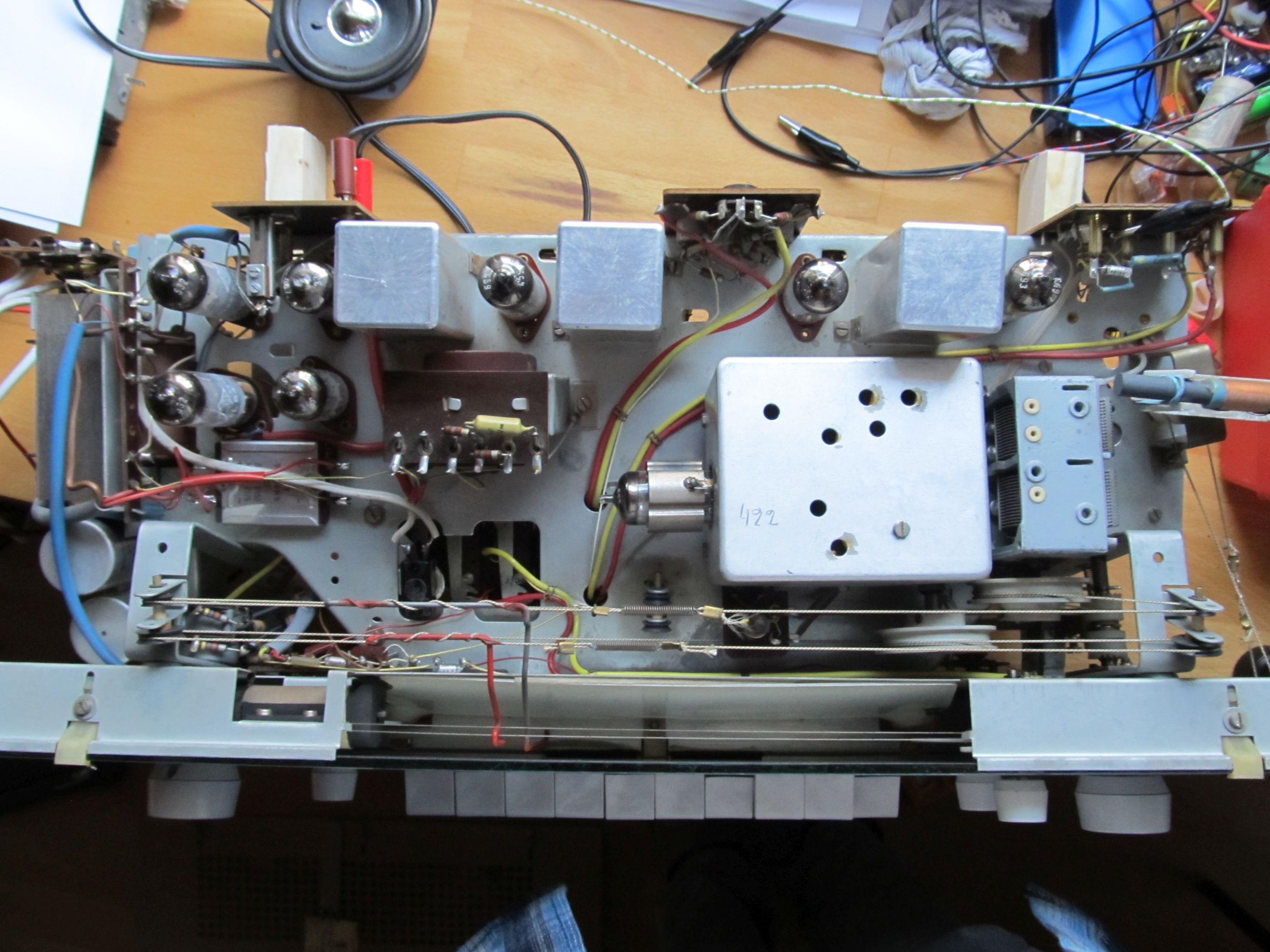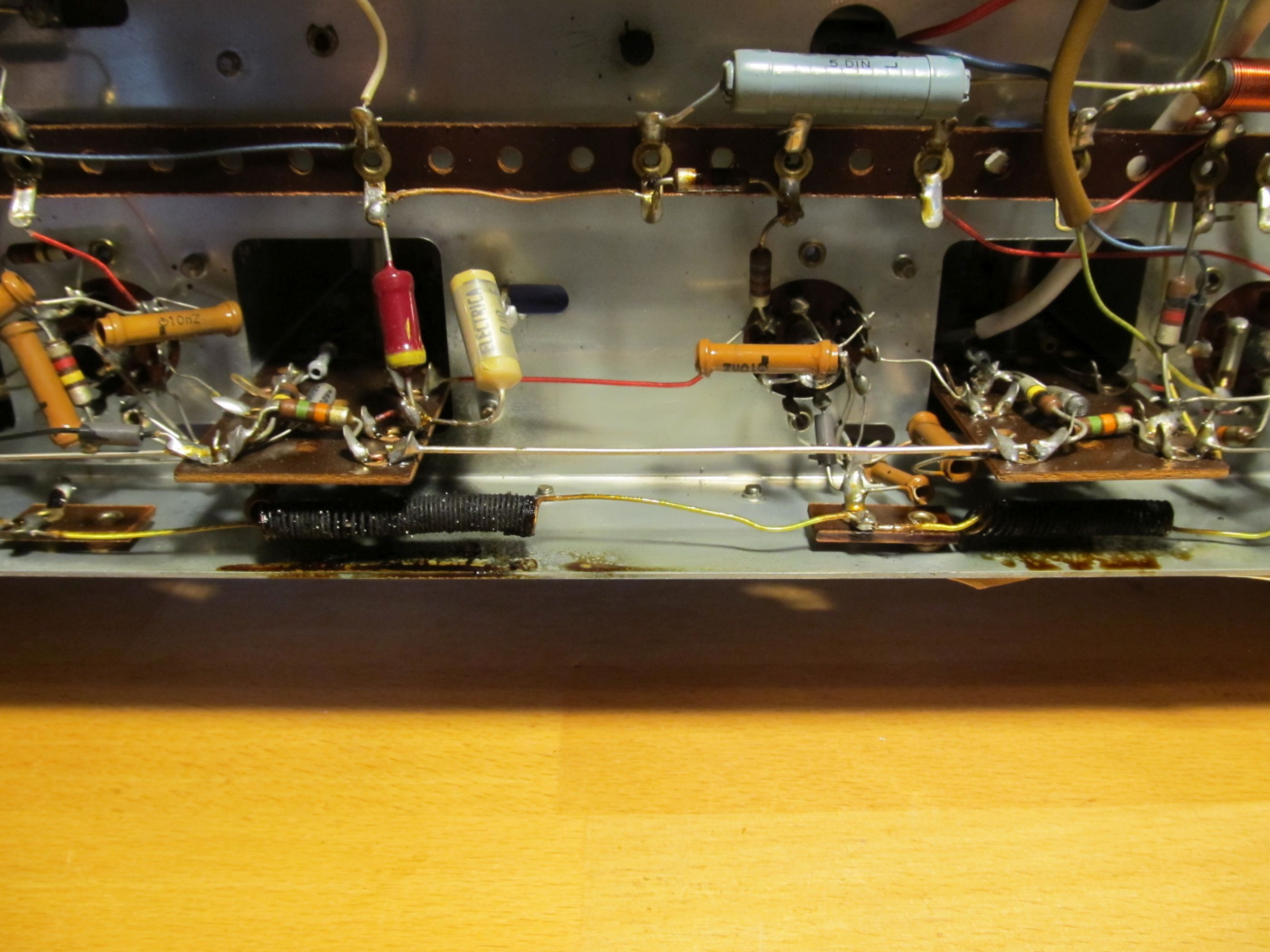 Um Folgeschäden zu vermeiden, solltest du unbedingt die Koppelkondensatoren an die Gitter der beiden Endröhren ersetzen, sofern es sich um Papierkondensatoren oder die 'Wima-Bonbons' handelt, denn wenn diese Leckstrom haben, wird über kurz oder lang der Ausgangstrafo oder der Netztrafo wegen Überlastung zerstört, auch die Röhren und der Gleichrichter mögen das gar nicht gerne. Eventuell hast du auch Glück: falls die ockerfarbenen Philips-Folienkondensatoren verbaut sind, musst du da nichts tun, die sind auch heute noch neuwertig.