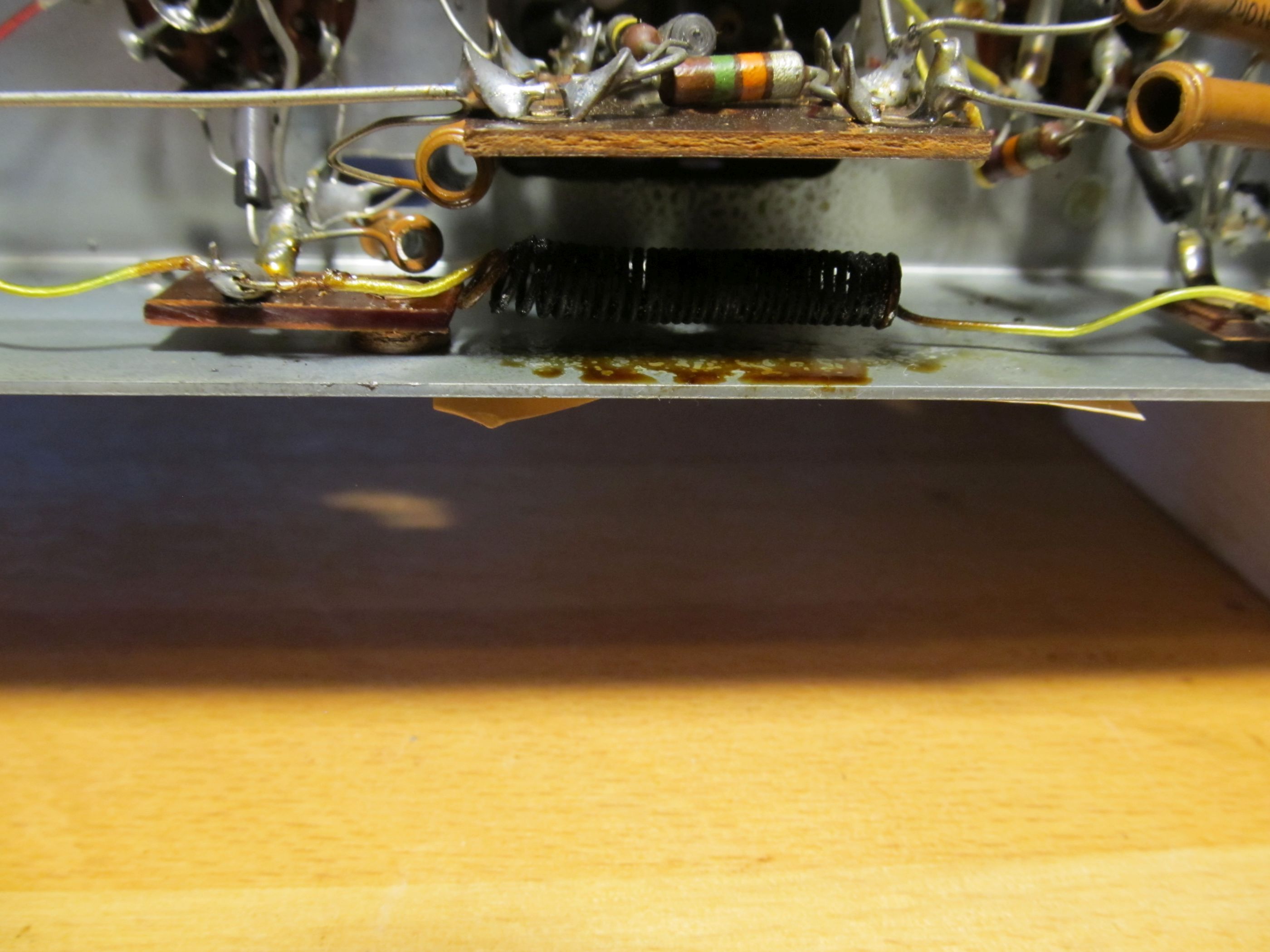 so wie ich dein Foto interpretiere, gibt es einen kleinen Widerspruch zum Schaltplanauszug. Nach Foto würde ich sagen, dass die Heizspannung vom Trafo zur ersten Drossel geht und von dort zur zweiten, während gemäss Schaltplanauszug die Drosseln nicht in Serie geschaltet sind. Bei Serieschaltung (so wie ich das Foto interpretiere), reicht ein Kurzschluss am Ende, damit beide Drosseln überhitzen. Das kann z.B. ein Kurzschluss in der Röhre sein oder auch eine verbogene Lötfahne am Röhrensockel, die dann bei Bewegung der Röhre einen Kurzschluss verursachen kann. Die Heizleistung vom Trafo reicht dann locker, um den doch recht dünnen Schaltdraht zum Glühen zu bringen. Somit solltest du diesen Pfad genau auf mögliche Kurzschlüsse prüfen. Die Kondensatoren dürften eher nicht die Ursache sein, denn hier müssen mehrere Ampère geflossen sein, und das passiert bei den üblichen Kondensatorfehlern nicht, zumal die Spannung mit 6.3V sehr tief ist. Ansonsten ein schünes Radio, und mit Gegentaktendstufe und zwei ZF-Stufen auch elektrisch ein edles Stück.