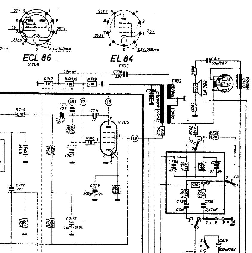 Bei der ECL86 ist ein Widerstand ziemlich verschmort habe ich gesehen, mal nachforschen welcher das ist. Die Verschaltung um die ECL86 ist ein ziemlicher Drahtverhau.