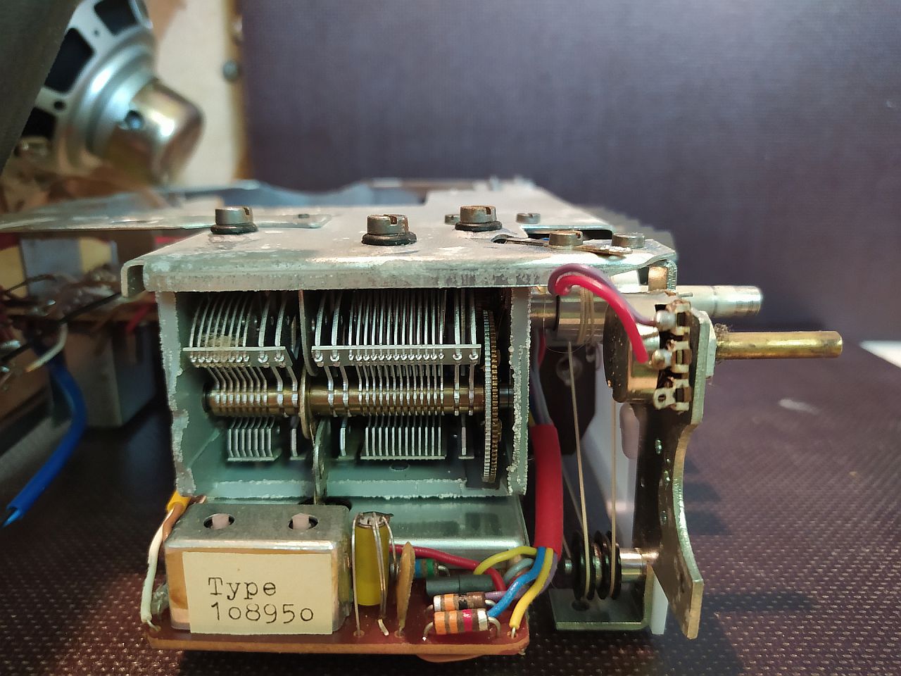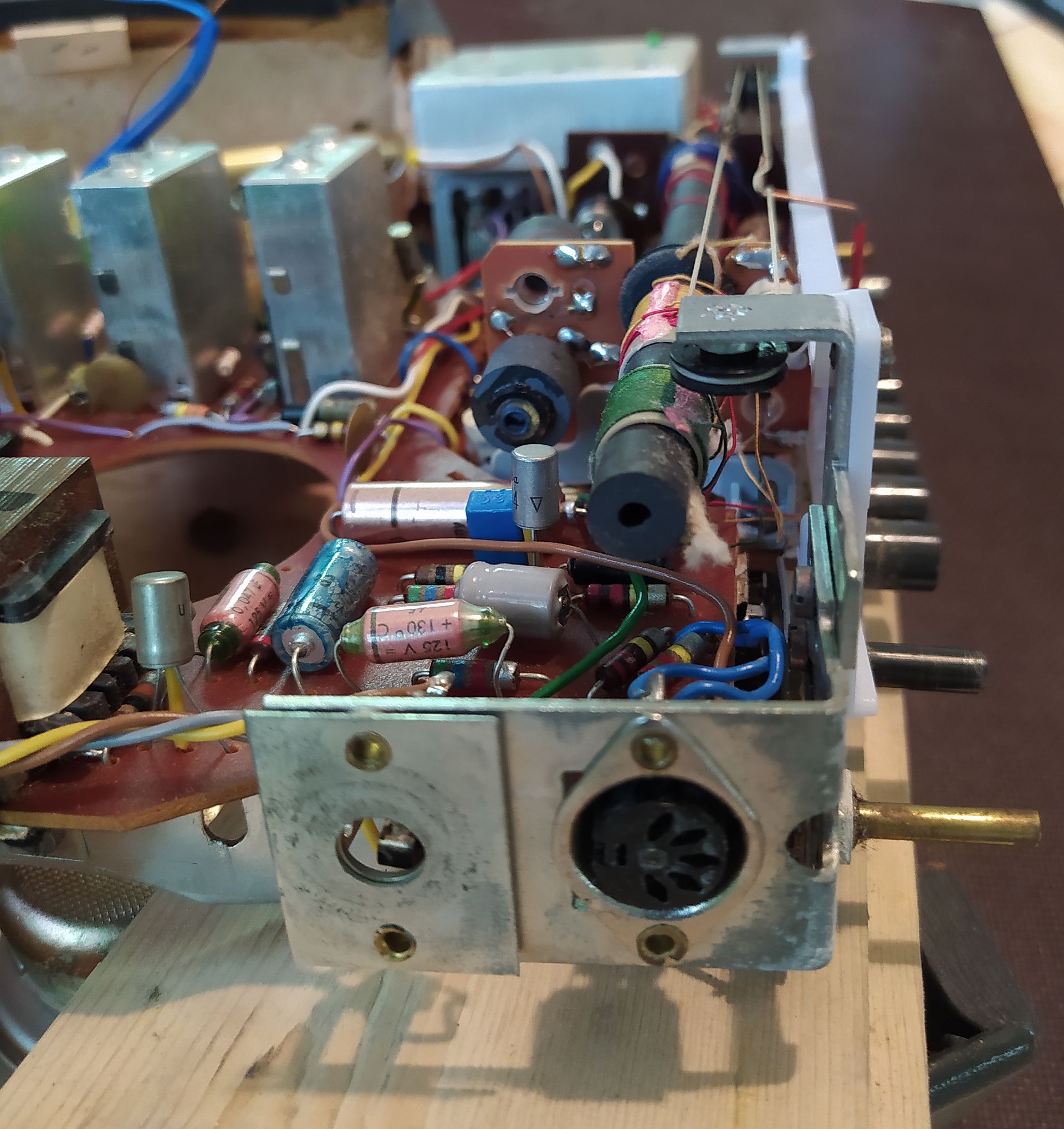 jetzt läuft das Gerät wieder. Da hat mal wieder jemand gepfuscht. Nachdem ich das Chassis ausgebaut hatte sah ich einen übergrossen Lötklecks der auch mit der benachbarten Lötstelle verbunden war. Deswegen konnte man den Ruhestrom nicht richtig einstellen. Obwohl das Poti schon auf Anschlag stand, betrug der Ruhestrom immer noch 46mA. Eigentlich sollte er bei diesem Gerät, laut Schaltplan, bei 9V Versorgungsspannung auf 15mA eingestellt werden. Beim Ausbau habe ich dann auch die Typenbezeichnung gefunden. Der Zettel klebt auf einem Filter neben dem Drehko. Im eingebauten Zustand sieht man da allerdings nicht hin (toll). Ach ja und dann gibt es noch die spezielle Ferritantenne mit einem Loch in der Mitte. Wozu soll denn das gut sein? Will man hier Material sparen, oder gibt es einen technischen Grund dafür.