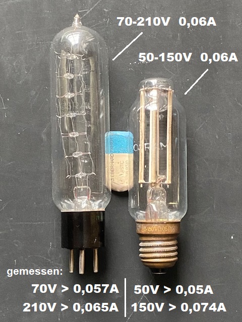 Ich habe in meinem Fundus auch noch ein paar Eisen-Wasserstoff-Widerstände (ohne Urdox) für einen Strom um 1A mit E17-Glühlampensockel. Die sehen hübsch aus.