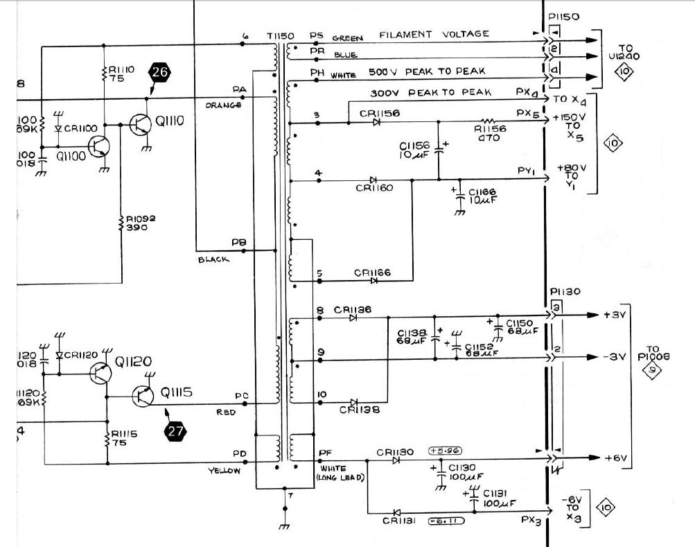 1.) So ziemlich alle Spannungen die im Bereich Bildröhre benötigt werden entstehen in einem einzigen DC-DC Wandler, u.a. hat der auch eine separate Sekundärwicklung für die Heizung der Bildröhre. Die Prüfung all dieser Sachen ergab: OK.