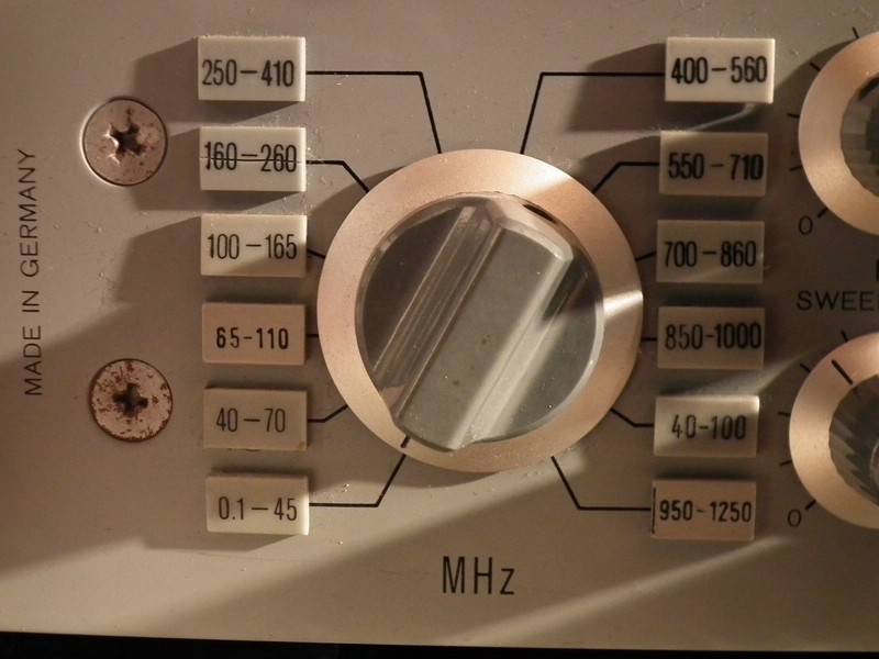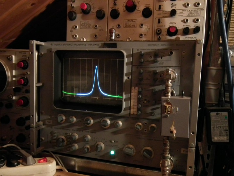 Die Bildröhre ist eine P7 (blau, lang nachleuchtend in gelbgrün). Ein kurzer Test vor dem Einladen zeigte eine schöne gerade Linie mit aufgesetzten Frequenzmarken, er lebt somit offensichtlich, weiteres später.