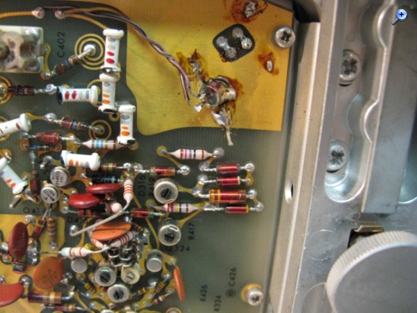 die Anschlüsse zum Röhrenhals; die Endstufentransistoren (sind das 155-0270 oder sowas) Sichtprüfung ob da verkokelte Widerstände o.ä. vorhanden sind