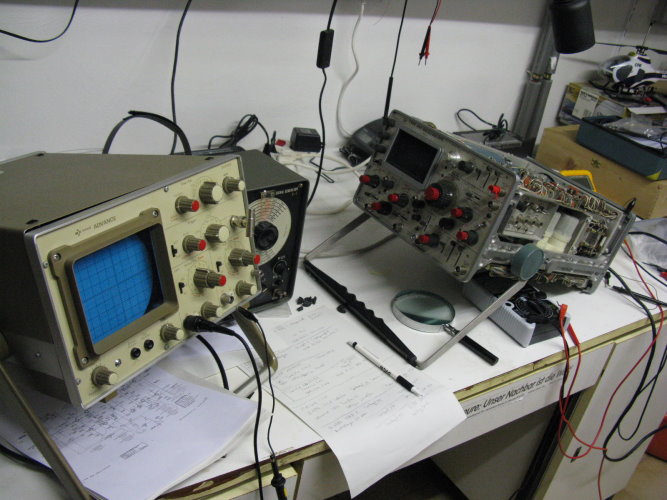 Hallo Martin und alle andere, Mein Tek 454 ist aufgewacht! Das macht schon Freude die ich gerne an Euch aus dem Forum hiermit mit Dank für die erhaltene Hilfe weitergebe. Kurzbericht dazu: Nachdem die Versorgungsspannungen überprüft und die defekten Transistoren auf Schaltplan 11 Horizontal Amplifier, Section 9 Diagrames, mit Hilfe von Martin´s Vorschlag gefunden waren, habe ich zwei npn Silizium Transistoren 2N3501 in Berlin und 12 pnp Silizium Transistoren 2N4122 in London, jeweils gefunden und gekauft. Diese Transistoren sind im Handbuch Section 7, Electrical Parts List, als Ersatzteile für die defekten Transistoren angegeben und auch so beschriftet. Von den 12 pnp Silizium Transistoren 2N4122 habe ich zwei, die ja eigentlich nur benötigt wurden, ausgewählt. Es sind das die mit den größten ß. Das auswechseln der Transistoren am Tek 454, selbstverständlich Spannungsfrei gemacht, ging praktisch ohne Werkzeug vonstatten. Tektronix hat das schon bei der Herstellung so vorgesehen und dazu schon 1966 Sockel eingebaut. Nach dem einschalten, aufwärmen, verbinden von CH1 und CH2 mit Testsignal (1 V; 1 kHz) sowie Suche der nötigen Einstellungen, war auf der CRT das so sehr gewünschte Bild zu sehen.