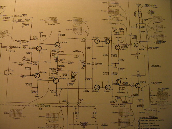 Kopie von Fig 4-12 Vertikal Output Amplifier circuit board, Handbuch. Erkennbar ist auch von woher die Lötstellen oben kommen. Hat jemand dazu eine Meinung? Funktioniert den so eine Schaltung wie in meinem Tek 454 überhaupt? So etwas finde ich leider nicht im Handbuch!