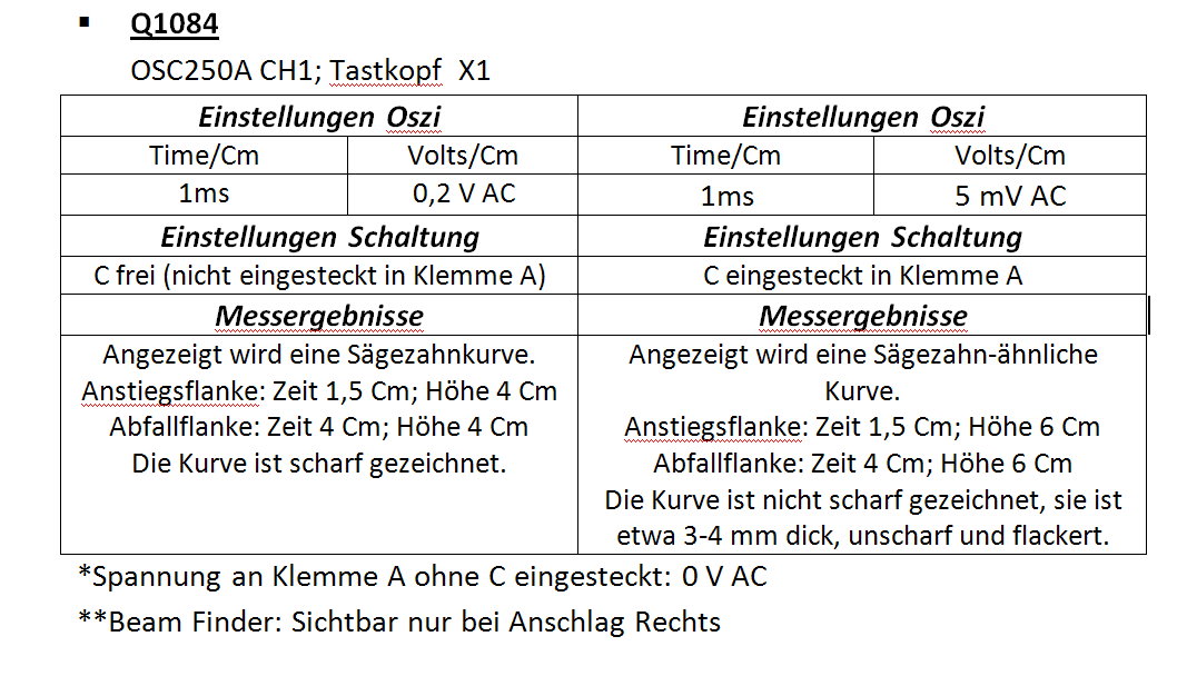  Q1084 mit Bas. und Koll. Anschlüssen (Em. ist ja für beide Transistoren an gnd) an die Klemmstecker von Q1094 mit Leiterbrücken angeschlossen. Anzeige OS250A (Einstellungen Time/Cm 1 ms und Volts/Cm 0,1 V), saubere, scharf gezeichnete Sägezahnkurve. Beam: Vert. Mitte. Horiz. Position 6,5. Beamschalter nach unten gedrückt: Beam auf Position 5.