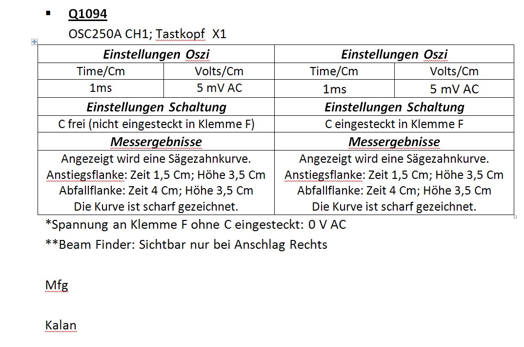 Bemerkung 1* Q1073 mit Q1063 vertauscht. Q1084 und Q1094 – alle Anschlüsse frei, in Klemmstecker nur C und D. Anzeige Oszi OS25A mit Tastkopf an Em von Q 1084 und Q1094: Sägezahnkurve scharf und gut gezeichnet. Anzeige Beam Oszi tek 454 Vert. Mitte. Hriz. +2 Teilungen von Mitte. Beam bei allen Versuchen gerade erkennbar obwohl Knopf für Intensity auf Anschlag Max (Rechts) gedreht. Q1073 mit Q1063 vertauscht. Q1084 und Q1094 – mit allen Anschlüssen in Klemmstecker. Anzeige Oszi OS25A mit Tastkopf an Em von Q1084 (Klemme F): nur horiz. Linie. Anzeige Oszi OS25A mit Tastkopf an Em von Q1094 (Klemme F): Sägezahnkurve scharf und gut gezeichnet. Anzeige Beam Oszi tek 454 Mitte. Hriz. Linke Seite -4 Teilungen von Mitte. Q1063 eingesteckt auf Seite von Q1094. Q1073 nicht eingesteckt. Anzeige Oszi OS25A mit Tastkopf an Em von Q 1094: Sägezahnkurve scharf und gut gezeichnet. Anzeige Beam Oszi tek 454 Mitte Vert. und Horiz (an keiner der 4 Abl.-Platten Spannung?). Q1063 eingesteckt auf Seite von Q1084. Q1073 nicht eingesteckt. Anzeige Oszi OS25A mit Tastkopf an Em von Q 1084: keine Sägezahnkurve. Anzeige Beam Oszi tek 454 Mitte Vert. und Horiz (an keiner der 4 Abl.-Platten Spannung?).