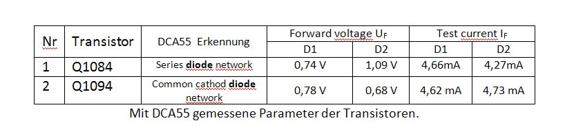 Nach Bedienungsanleitung des DCA55 erfolgt die Meldung Series diode network bei Bauelemente mit zwei Dioden, die in Reihe geschaltet sind. Ein bekannter Typ einer Dioden-Reihenschaltung ist der Philips SOT-23 BAV99. Nach Bedienungsanleitung des DCA55 erfolgt die Meldung Common cathod diode network bei Bauelemente mit zwei Dioden, bei dem beide Kathoden miteinander verbunden sind, wie z.B. der Philips SOT-23 BAV70. Die Bedienungsanleitung des DCA55 enthält auch den Hinweis daß bei defekten Transistoren oder bei solchen die keine oder eine sehr kleine Verstärkung haben das DCA55 nur eine oder zwei Dioden Sperrschichten innerhalb des Bauelementes erkennt. Ob diese zwei Situationen bei den eingebauten Transistoren Q1084 und/oder Q1094 zutreffen ist mir nicht bekannt. Die im Manual vom tek 454 Seite 7-18 gefundenen Angaben {selected from 2N3119} habe ich noch nicht entschlüsselt.