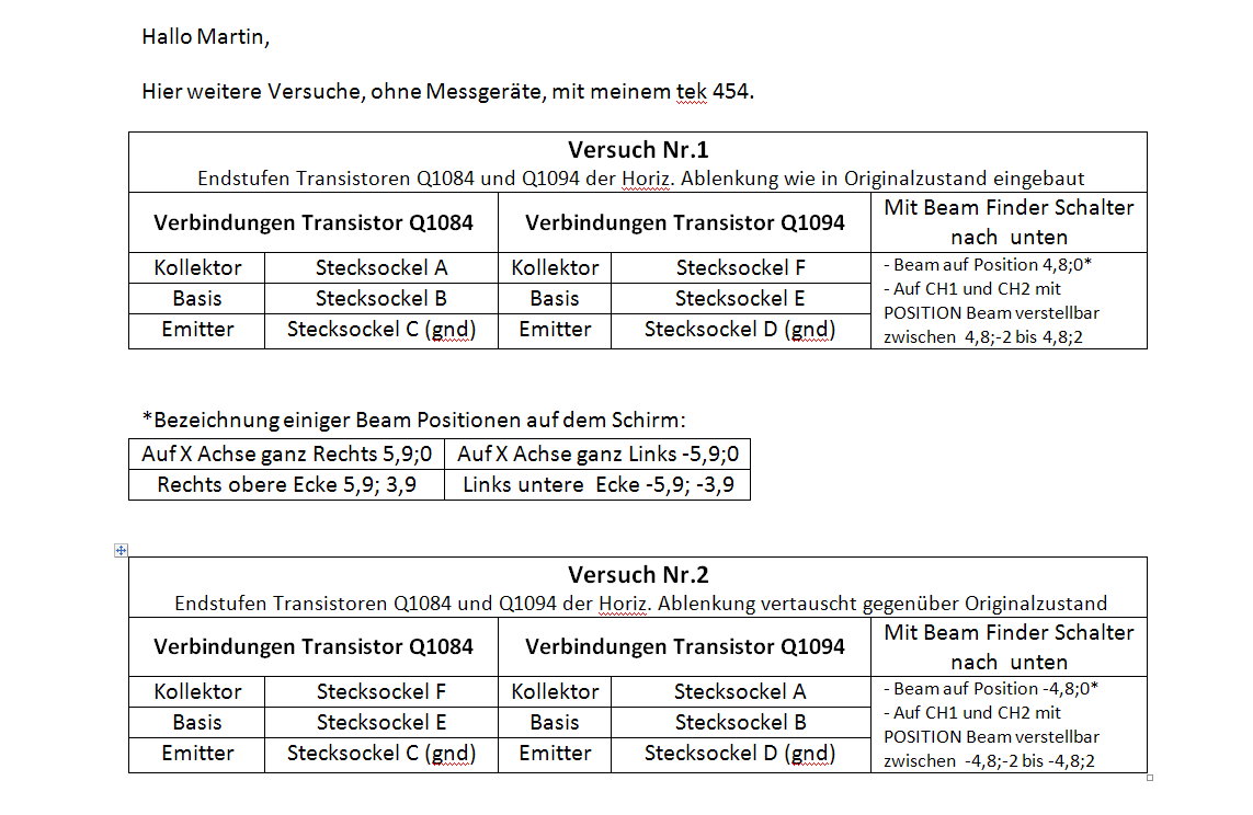 deine Messorgie hat nicht viel zutage gebracht, ich wollte lediglich daß durch Vertauschen der beiden eines jeden Paares am 454 geguckt wird ob der horizontale Offsetfehler auf der selben Seite des Bildschirms geblieben ist oder ob er die Seite gewechselt hat, wenn das der Fall ist hast du das defekte Teil definitiv erwischt ! Das geht völlig ohne Messgeräte.