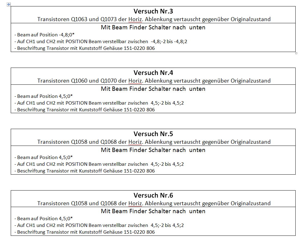  Bas. und Koll. von Q1094 mit Leiterbrücken unter Beachtung der Klemmstecker für Bas. und Koll. an Klemmstecker von Q1084 angeschlossen (gleichwertig mit Transistortausch). Anzeige OS250: Tastkopf auf Kollektor von Q1084 eine saubere und scharfe Sägezahn Kurve. Beam: rechts. Beim nach unten drücken des Beam FINDER Schalters Punkt bewegt sich in etwa 25% der Skalenbreite nach links. Horizantale Verstellung nicht wirksam.