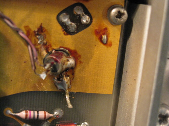 Unbekanntes, verschmortes Bauteil, bestimmt so nicht von Tektronix, auf der Platine von meinem Tek 454.