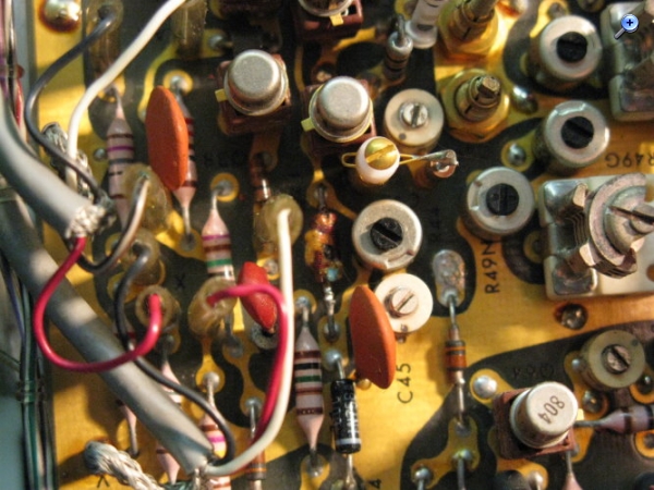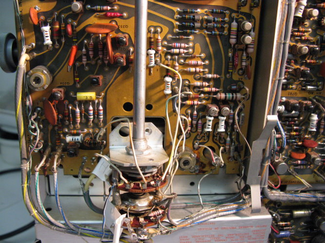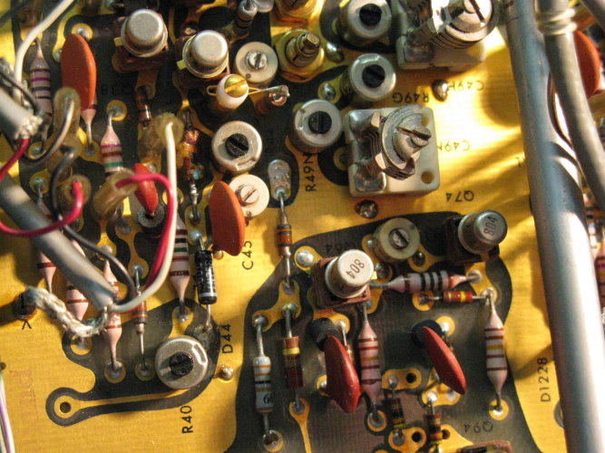 Stimmt. Frage hat sich damit erledigt. Danke. Habe übersehen das die Transistoren Q394/Q494 Typ 2N3866 für die vertikale Ablenkung nur ähnlich (Kollektor am Gehäuse, LEAD CLAMPED TO CASE) mit den Transistoren Q1084/Q1094 Typ 2N3501 für die horizontale Ablenkung, sind. Nicht leicht erkennbarer Punkt im Schaltplan. Bleiben jetzt nur noch zwei Probleme: 1.) Das kuriose verschmorte Bauteil oben rechts auf der Platine Vertical output amplifier. Ist das der Anschluß +/- From Delay Line??? 2.) Durchdrehender roter Knopf bei CH2 Volts/Div. Kann ich die Platine unten, die den Schalter verdeckt lösen, nach unten wegziehen und geht das ohne die Frontplatte zu entfernen???