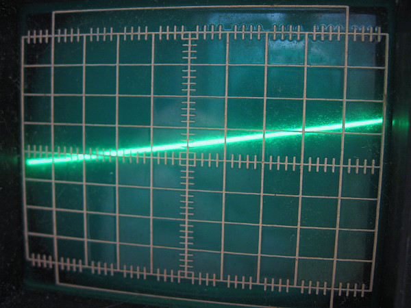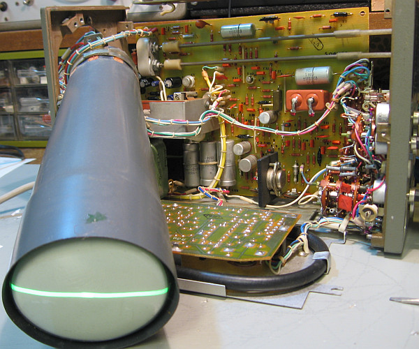 Leider zeigte sich dann ein schräger Strahl. Ich bin dann zur Überzeugung gekommen, dass die Bildröhre nur etwas verdreht werden muss, denn in allen Stellungen zeigt sich der gleiche Fehler. Ich habe keine Erklärung, warum die Bildröhre so schief sitzt. Vielleicht liegt es am Schaumstoff für die Auflage der Röhre, der so langsam bröselig wird. Das Oszi hat auch mehrere Umzüge mit langen Fahrstrecken und Vibrationen hinter sich.
