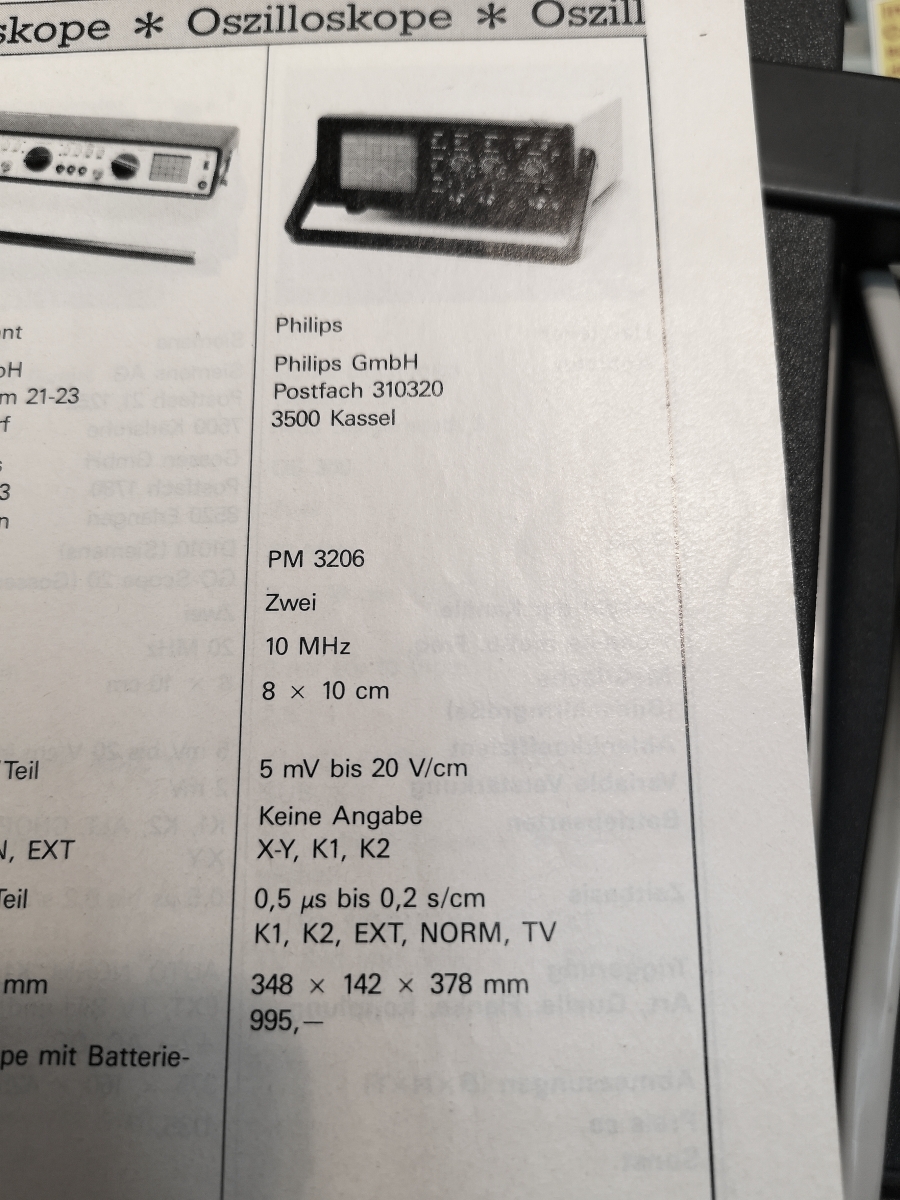 Jetzt noch eine Anzeigenausschnitt aus einer Oszilloskopvorstellung aus einem Elektorsonderheft "Messgeräte" aus 1988. Allerdings nur das kleinere Modell PM 3206 mit 10 Mhz Bandbreite. 995 DM hat es zu der Zeit gekostet. Das 15MHz Modell kostete sicher vielleicht um die 1100DM. Für Lehrlinge und Studeneten war das viel Geld! 1988 hatte ich brutto ~ 700DM Ausbildungsvergütung beim Staat. Ich weiss es nicht mehr so genau. Lehrlingsgehaltszettel habe ich auch nicht aufgehoben. Mit 520DM brutto im 1. Lehrjahr 1984 begann es jedenfalls bei mir! Da konnte ich mir kein Hameg 204 (20MHz) leisten. Ein Hameg 107 wurde es bei mir erstmal neu für 650DM ungefähr Ich habe das aber leider nicht mehr, sondern Anfang der 90er verkauft. Danach immer von der Firma ausgeliehen. Den dir bekannten 535A hatte ich auch dann. Dann kam ein 465B und 468 bis heute.