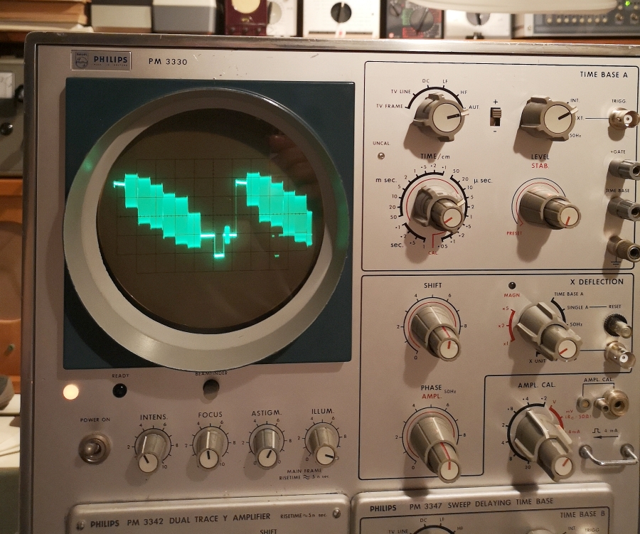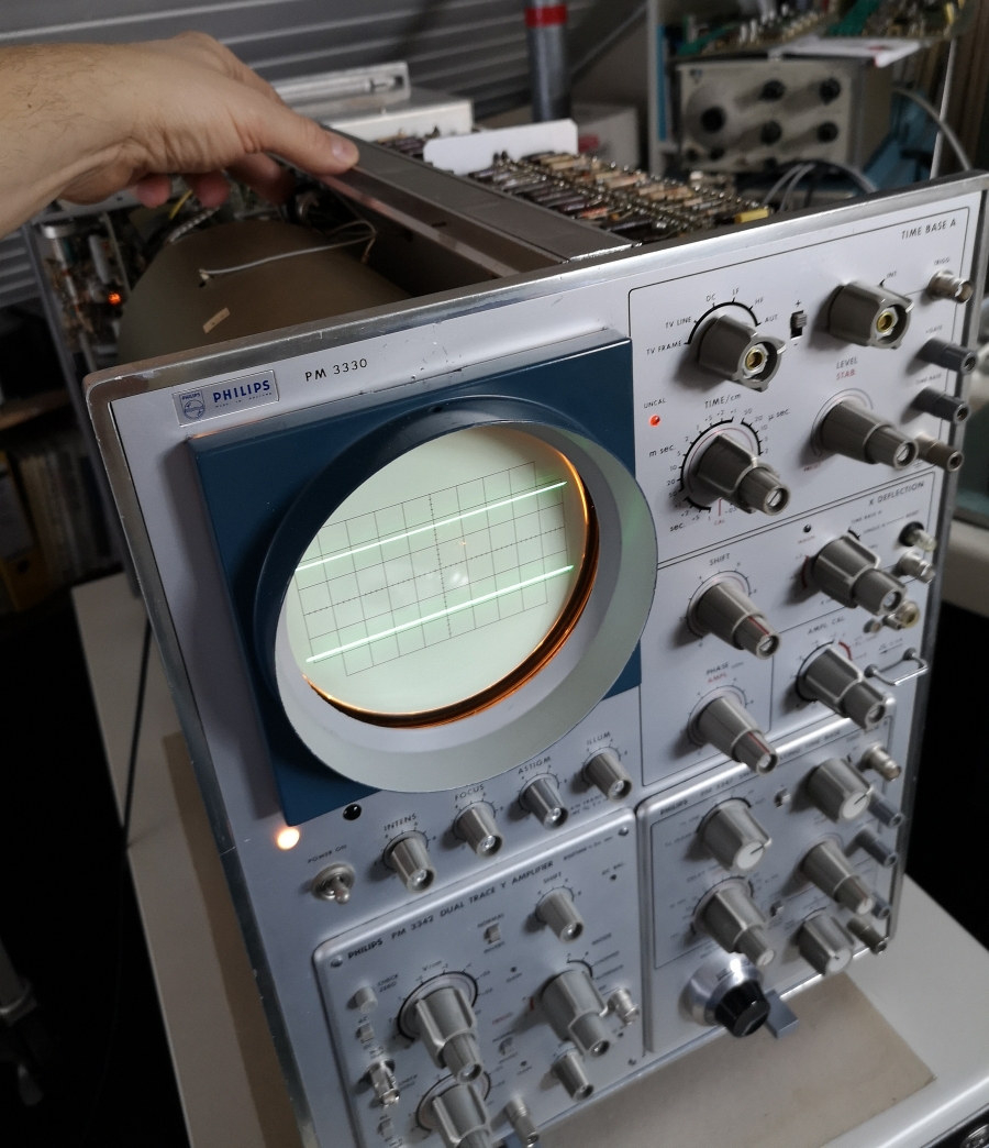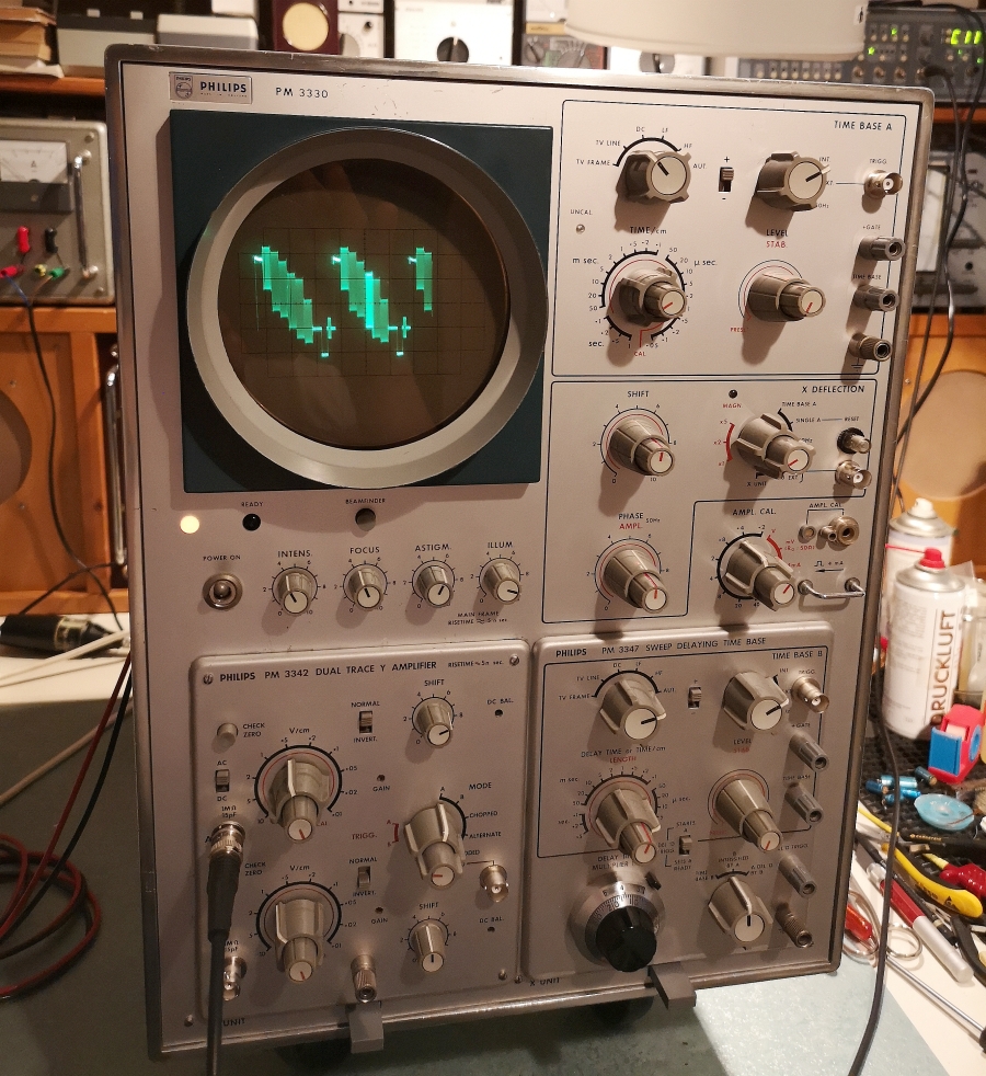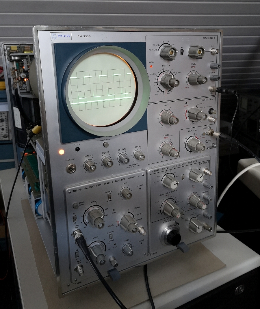 Gegenüber dem sehr verbreiteten kleineren PM 3230 (10MHz teils noch Röhren) und 31 (15MHz) ist der PM 3330 doch relativ selten zu finden. Ich bin froh einen gefunden zu haben, damit man sieht was die europäischen Firmen doch auch auf die Reihe gebracht haben und nicht nur Tektronix mit dem 535A und 545A vorherrschte. Philips hat ja danach noch einen Nachfolger - den PM 3370 (Bandbreite 150MHz) gebracht, aber den habe ich ausser im Prospekt noch nie leibhaftig wo gesehen. Dann war auch Schluss bei allen europäischen Firmen mit solchen großen Laborscopes, weil nun Tektronix mit seinen zugegebenen sensationellen 7000er Laborscopes seinen Siegeszug antrat. Wenn man sich mal vorstellt, Tek hat 1969 losgelegt mit dem 7704 Scope. Sehr elegant in Erscheinung, fein in der Haptik und mit der Sensation Readout, d.h. Anzeige der Einstellungen der TB und Vertikalabschwächer. Da sieht was möglich war, wenn eine Firma sich 100% auf Scopes fokussierte und nicht wie Philips und vorallem Siemens auch Wschmaschinen, Atomkraftwerke, Leitungsschutzschalter, Bildmeister Fernsehgeräte und Bügeleisen herstellt. Da konnten Scopes nur eine Randabteilung bleiben.