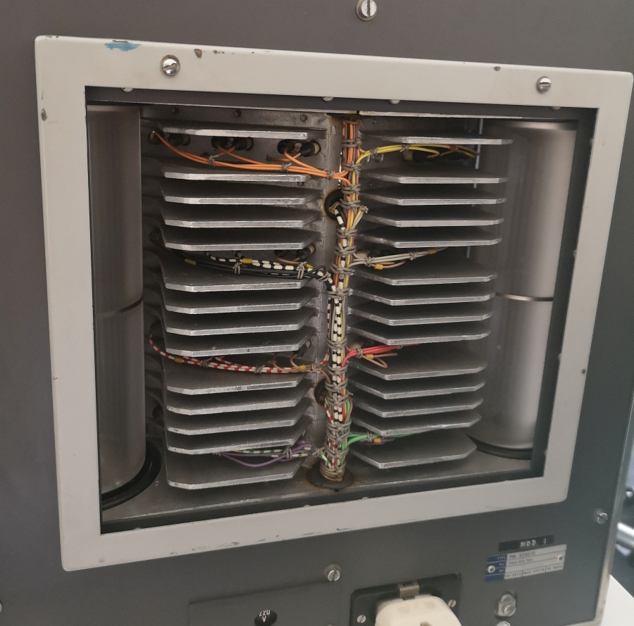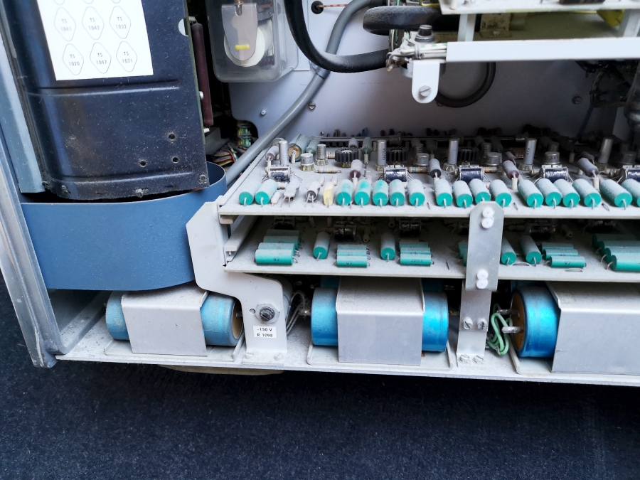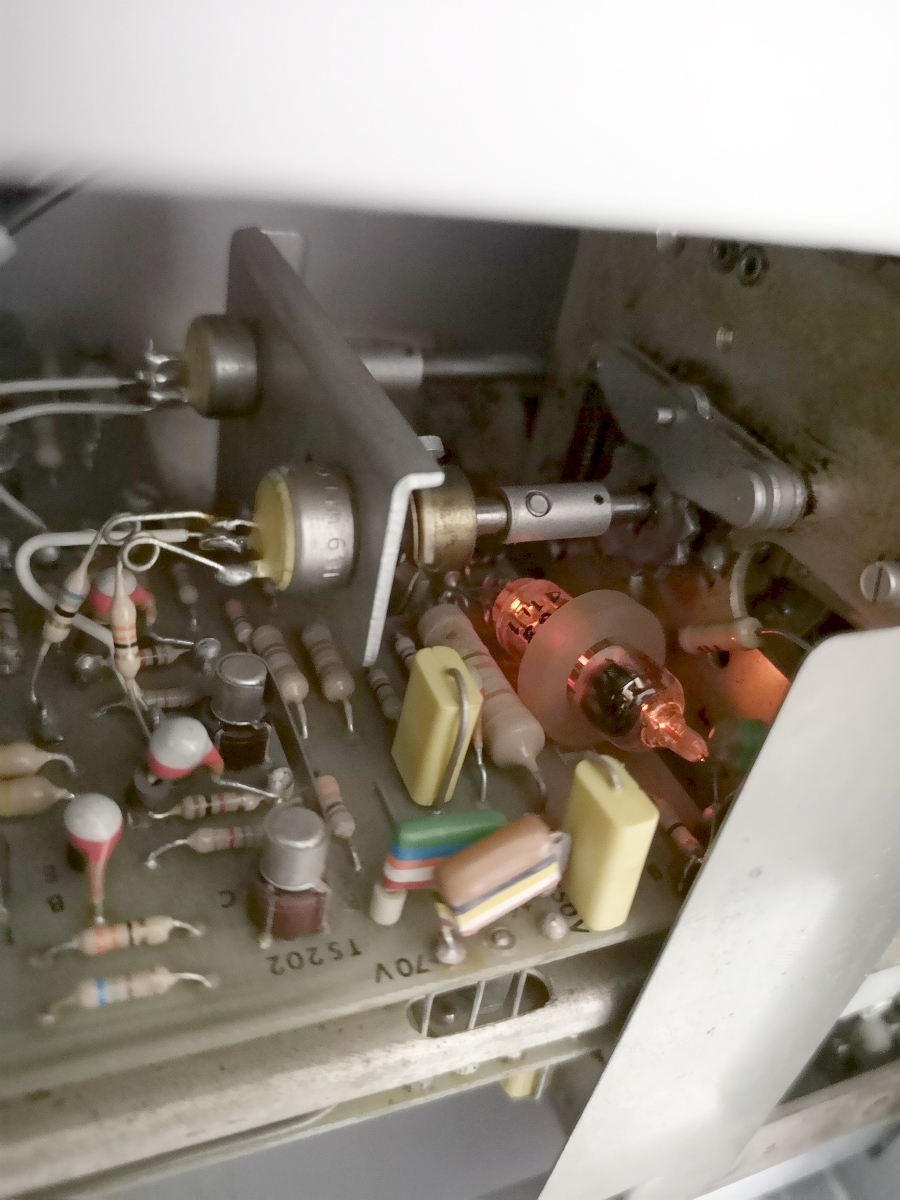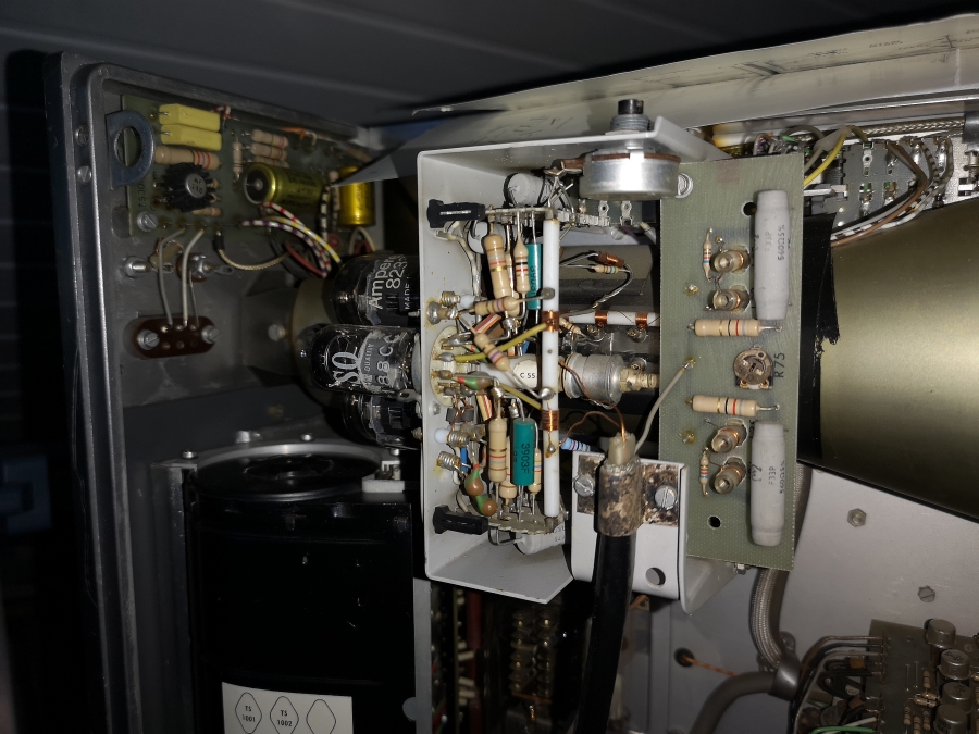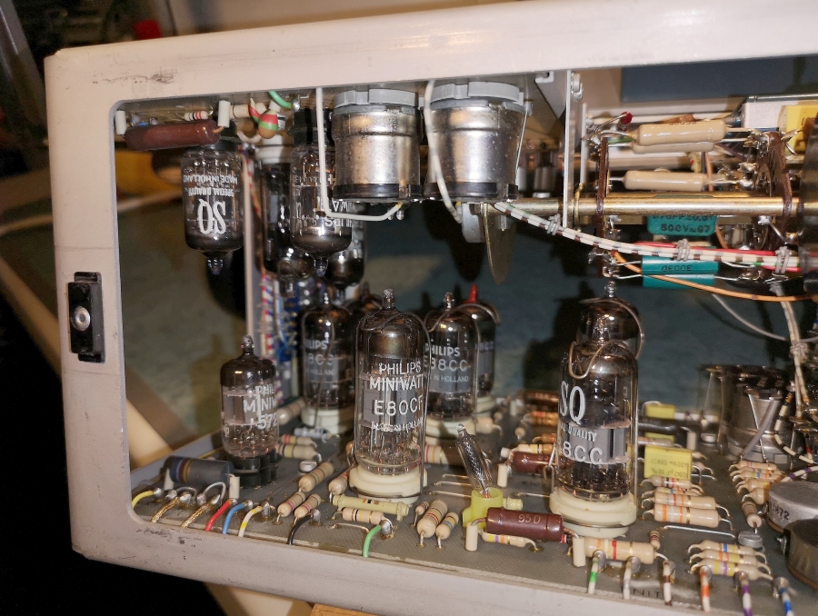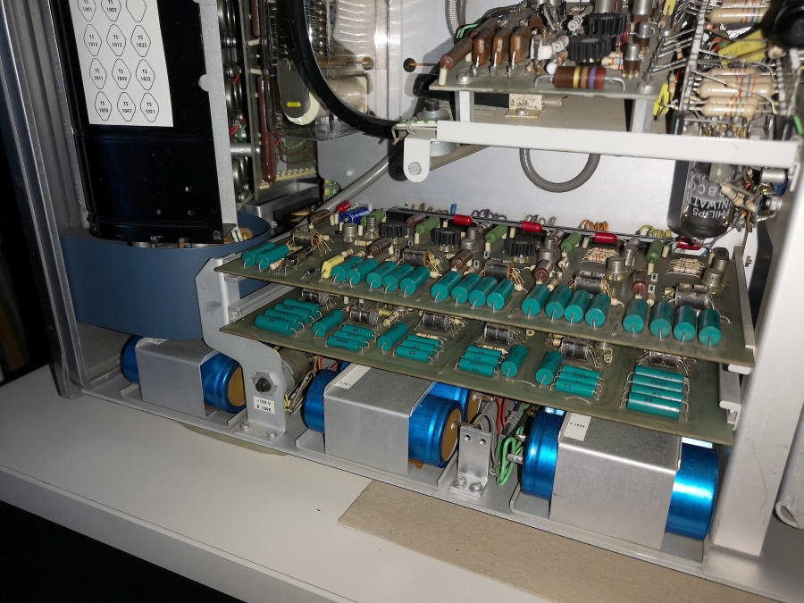 Die Zeitbasis ist noch in Vollröhrentechnik seit 1966 und wurde bis zum Produktionsende beibehalten. Man erkennt die durchweg Philips SQ Röhren Bestückung = Philips Special-Quality = Langleberöhren.