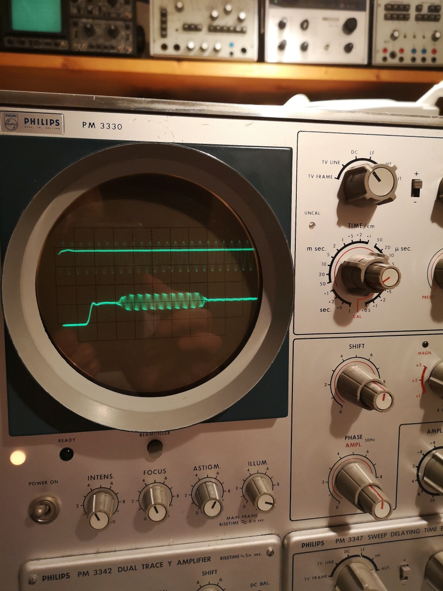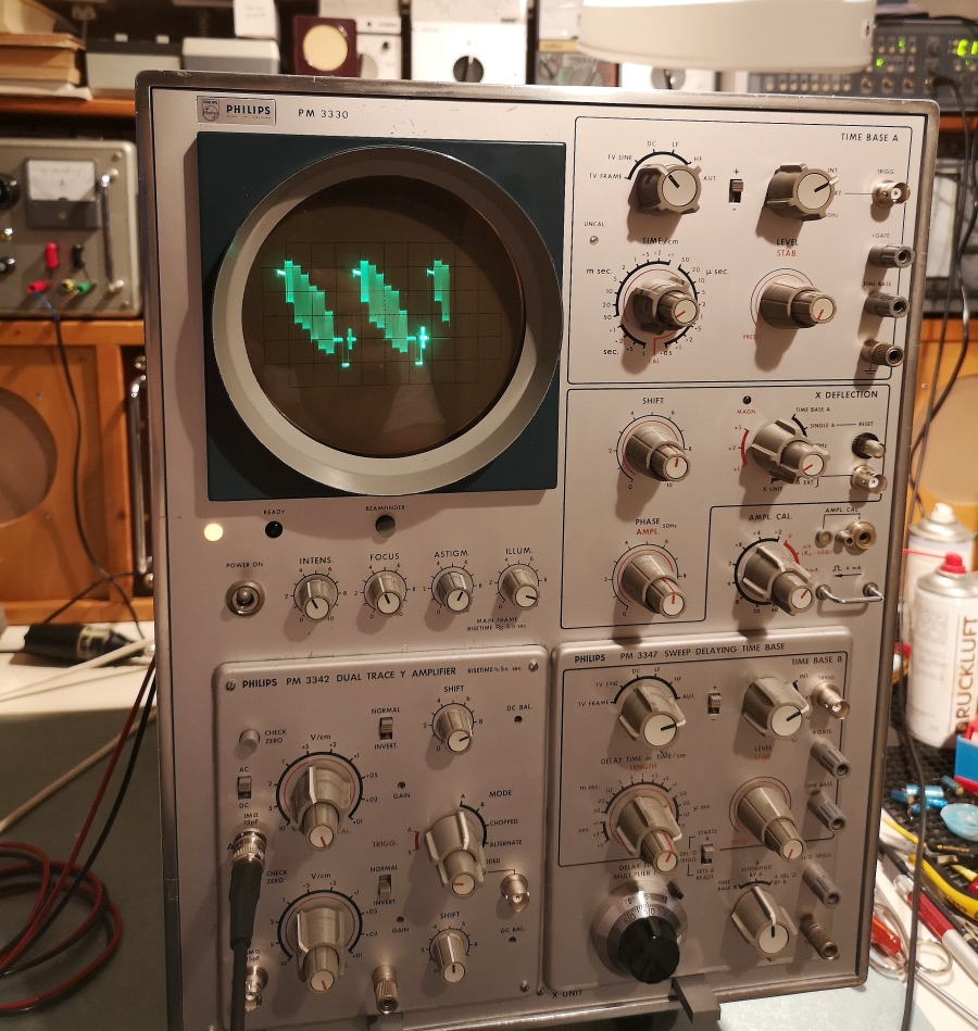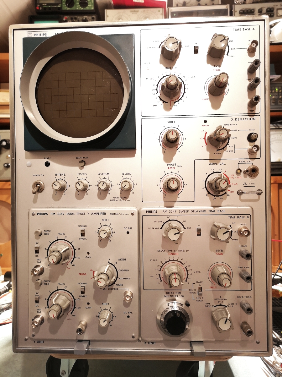 Ja.... ein schönes Beispiel von leistungsfähigen Philips Laboroszilloskopen aus 1966. Bandbreite 70MHz. Mit den Einschüben nochmal im Überblick: Timebase PM 3347 und Zweikanaleinschub PM 3342. Es gab da auch eine ganze Reihe von weiteren Einschüben, aber ich habe nur noch den typischen Vierkanaleinschub PM 3344 dazu.