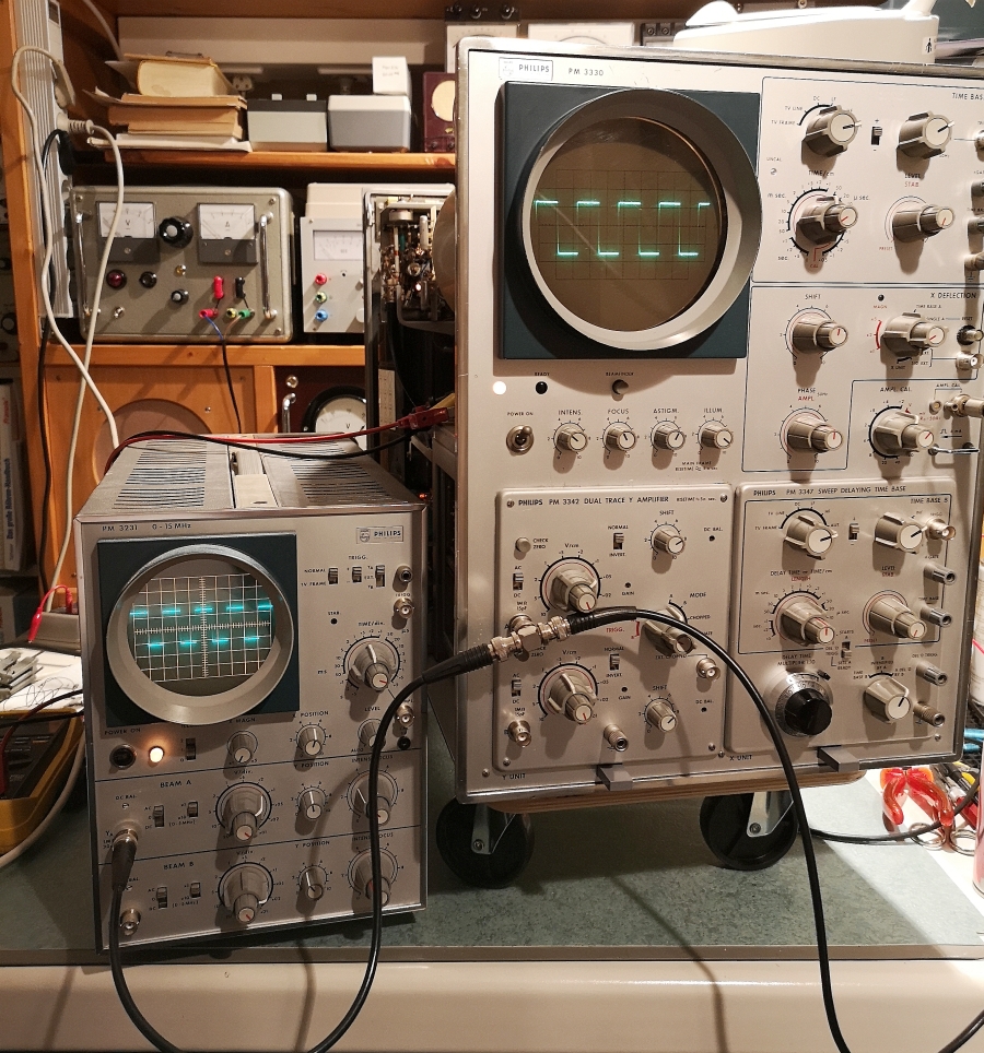 Hier noch ein Bild der PM 3330 mit seinem kleinen Werkstattbruder dem PM 3231 und Signal aus dem internen E88CC Calsignalgenerator. Ich habe für den PM 3330 dessen Kontrastscheibe aufgesetzt, die allerdings in den Jahrzehnten nachgedunkelt ist. Ich lasse sie der Vollständigkeit aber drauf. Leider leuchten diese leider längeren Glühlämpchen mir nicht direkt auf das Innenraster. Der kleinere PM 3231 hat noch kein Innenraster.