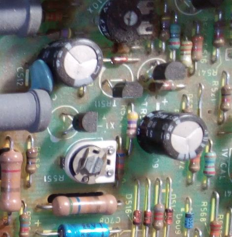 Das ist interessant. Laut Schaltungsunterlagen haben die ELkos C513 und C509 100 µF / 16 V. Tatsächlich sind Elkos mit 30 Volt eingebaut, obwohl nur eine Gleichspannung von 11 Volt an diesen Elkos anliegt. Da die verbauten recht klein sind, gehe ich von ihrer Bauform davon aus, dass sie vielleicht vor etwa 20 Jahren oder später getauscht worden sind. Bei mir sind die beiden Elkos schwarz in stehender Ausführung. Man sollte also diese Kandidaten vorsorglich austauschen. Sie glätten die Speisespannungen für die Zeitbasis und den Trigger.
