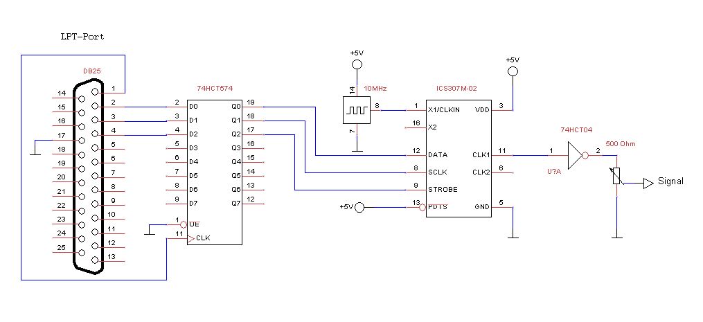 ich bin auch auf der Suche nach einem günstigen Frequenzzähler. Man muss abwarten können. Was den Frequenzgenerator angeht, da habe ich ein interessantes IC (ICS307) gefunden. Man kann mit dem Baustein Frequenzen zwischen 6 und 200MHz generieren (mit einem nachgeschalteten 74HCT393 geht die Frequenz deutlich unter 6MHz). Allerdings gibt der Baustein nur Rechteck-Signale aus und man muss ihn über eine I²C ähnliche Schnittstelle programmieren. Mein Rechner hat noch einen Printer-Port. Mit ihm kann man das Bauteil leicht programmieren. Ich habe mir hierfür mal eine (sehr provisorische) Routine in Delphi geschrieben. Meine kleine Schaltung ist immer noch auf meinem Steckbord aufgebaut. Muss sie gelegentlich mal in ein Gehäuse stecken, denn bei den höheren Frequenzen machen sich diese Bords schon bemerkbar.