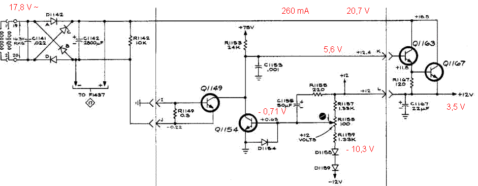Die Leistungsaufnahme ist insgesamt zu gering, alle Sicherungen sind intakt. So habe ich das Netzteil zunächst am Wickel. Die Spanungen +150 Volt, +75 Volt, -12 V sind o.k. Lämpchen auch. Nur die +12 Volt nicht, die nur rund 3,5 Volt liefert, bei Stromabgabe von 260 mA. Da sämtliche Platinen +12 Volt brauchen, muss die Ursache gefunden werden.
