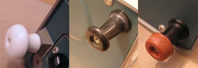 Den Porzellanknopf habe ich mit Sekundenkleber an einem Trapezfuß befestigt, der selbst reversibel am Blech haftet. Die beiden halb kaputten haben jetzt Gummifüße (rechtes Bild). Das Gerät steht nun wie ne Eins, wenn es mal sein muss. Der Filter ist aus grünem Filzstoff. Nach vorsichtiger Reinigung des Gehäuses und der Frontplatte blitzt alles wie neu. Bei dieser kamen nur Pinsel, Zahnbürste, Brillentuch und zum Befeuchten Wasser mit Spüli zum Einsatz. Für die Gehäusebleche viel Wasser mit flüssigem Colorwaschmittel und ein weicher Schwamm.