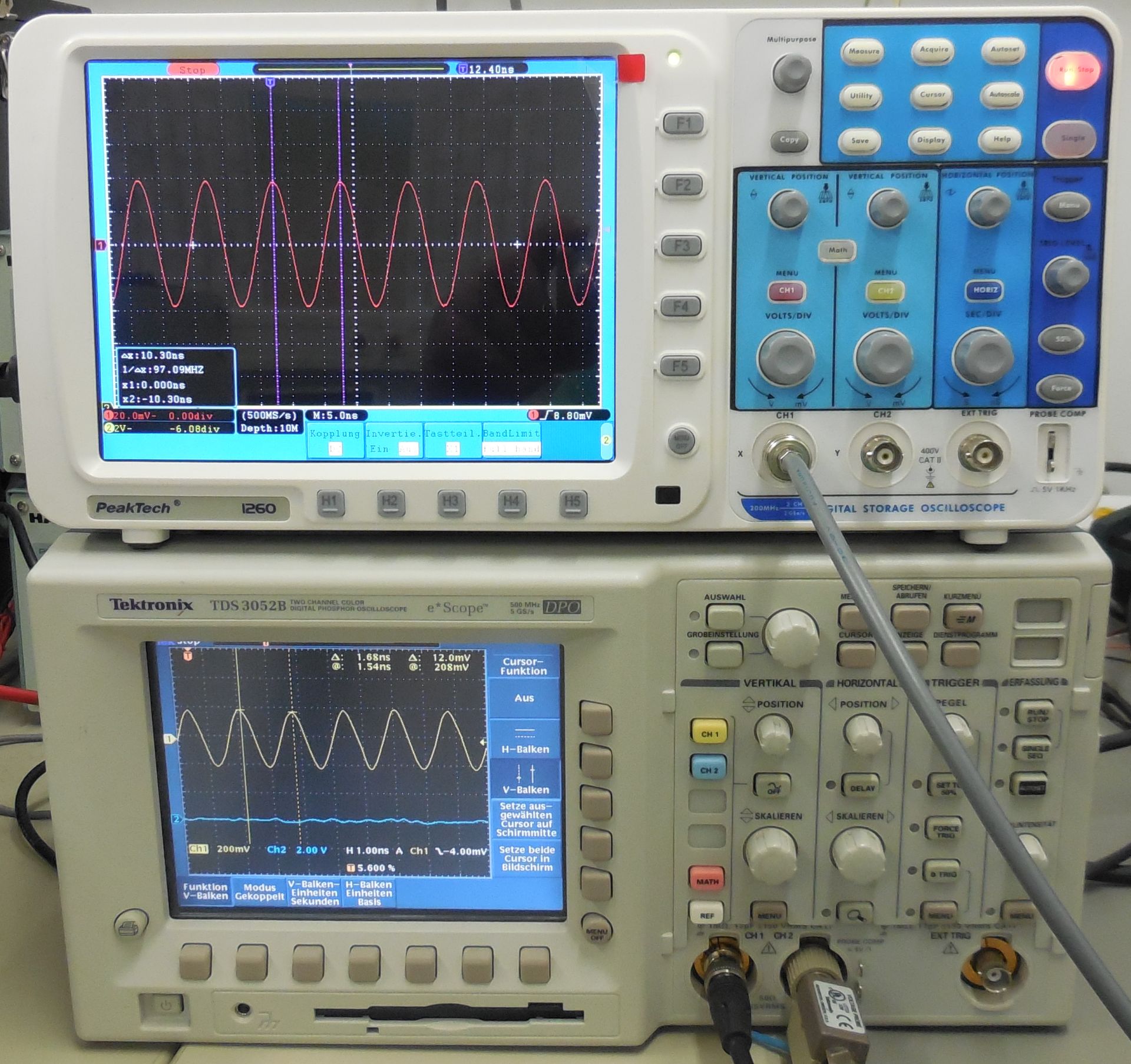 also, bis 200MHz ist der Oszi gut zu gebrauchen, wenn man auf die Genauigkeit der Amplituden einen nicht so grossen Wert legt. Bei höheren Frequenzen wird der Strahl sehr unscharf, bis man dann nur noch einen hellen Balken sieht, dessen Amplitude bei noch höheren Frequenzen jetzt deutlich abnimmt. Als ich allerdings in die Region über 500MHz kam sah ich plötzlich eine Resonanz. Ich habe jetzt mal statt dem sehr kurzen Koax-Verbindungskabel ein längeres verwendet. Die Frequenz war fast gleich. Auf einem parallel angeschlossenem Oszi kann man diese Oszillation erkennen. Aus irgendeinem Grund kommt der Tek in einem ganz kleinen Bereich in Resonanz.