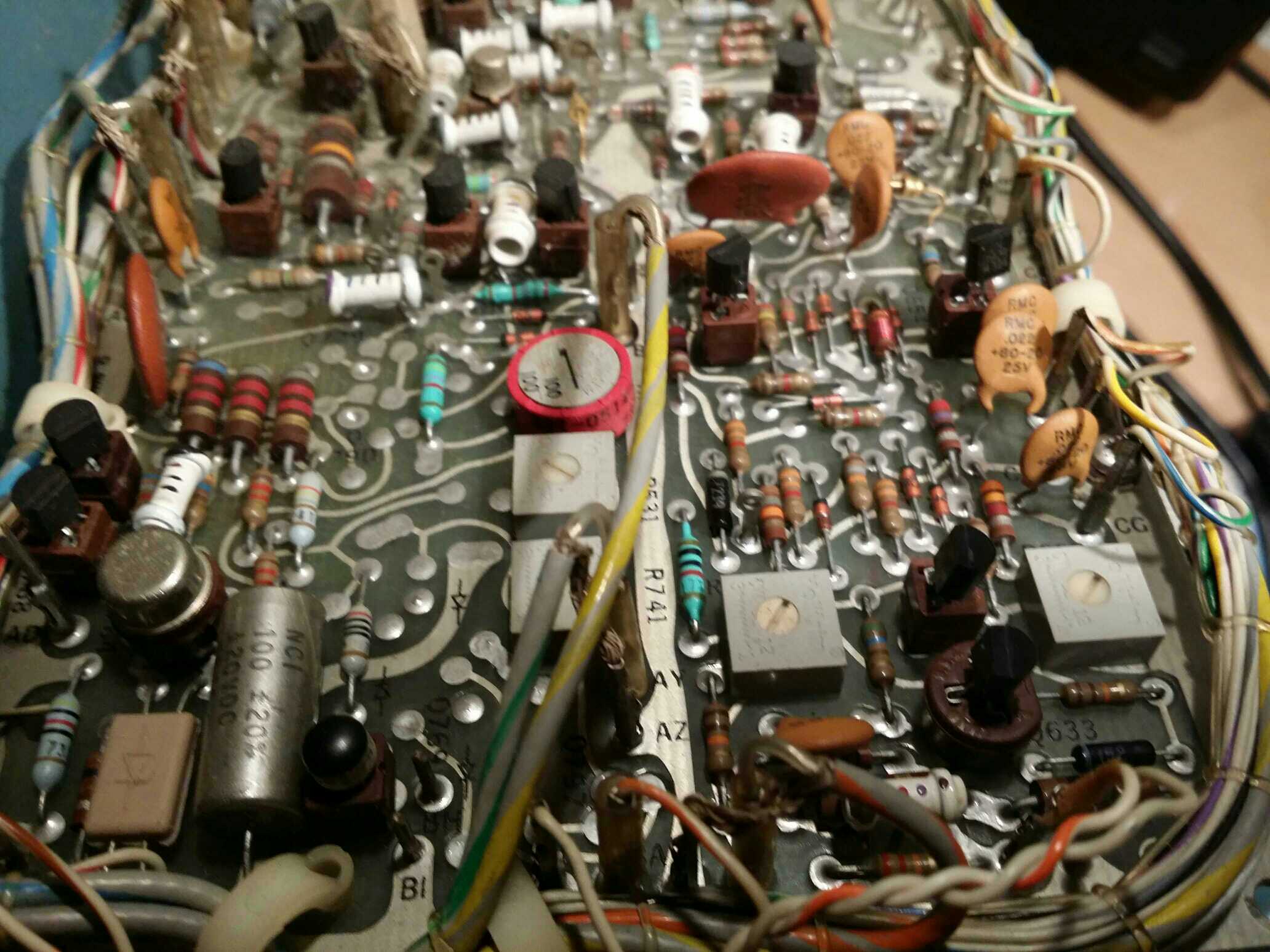 Zumindest sieht es von innen mehr nach "Bedienungsanleitung" aus. Allerdings fällt hier auf, dass der Vorbesitzer bereits etliche Transistoren gegen neue ausgetauscht haben muss, auch auf der Unterseite.