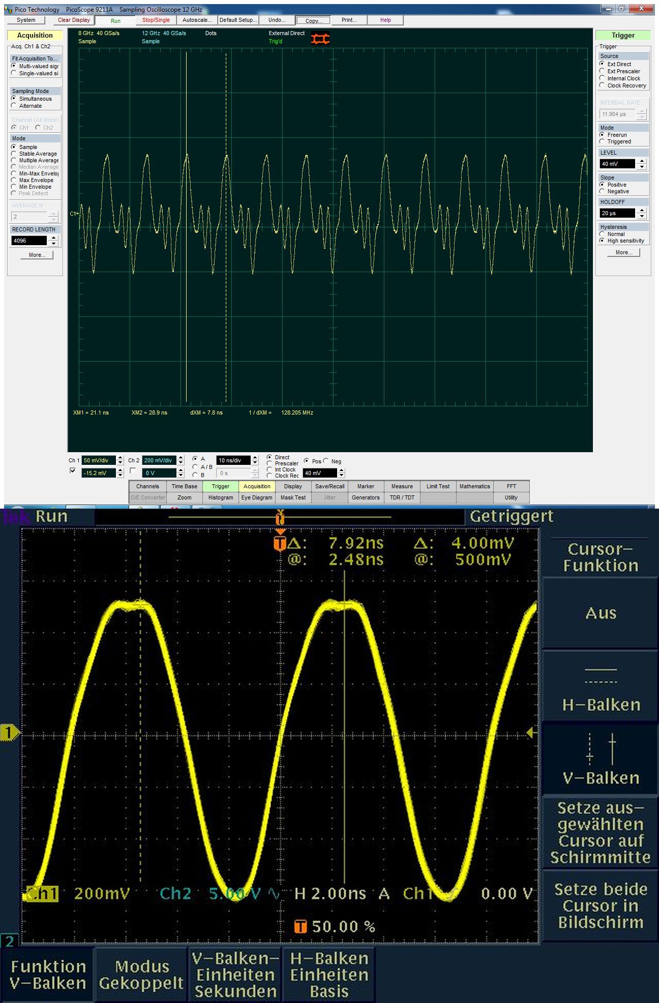 Der arme Tek hat 5Gs/s, d.h. ihm bleiben hier nicht mal 8 Punkte im Durchlauf einer Schwingung zum festlegen der Amplitudenform. Also vier oben + 4 unten. Den Rest der Form hat er sich errechnen müssen.