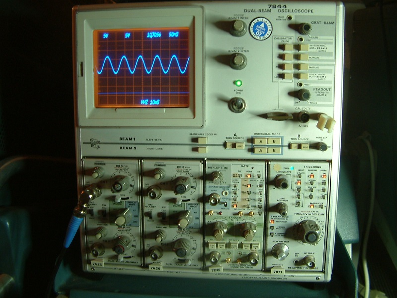 der ist schon hübsch, ja. Er war der letzte analoge Dual Beam von Tek, danach kam digital. Da hat die Fa. nochmal alles gegeben, 7844 war ein Flaggschiff (und für Bastler unbezahlbar) blau = Werksoption 78, P11 Phosphor für Polaroidkameras. Eine solche hatte er auch im Gepäck.
