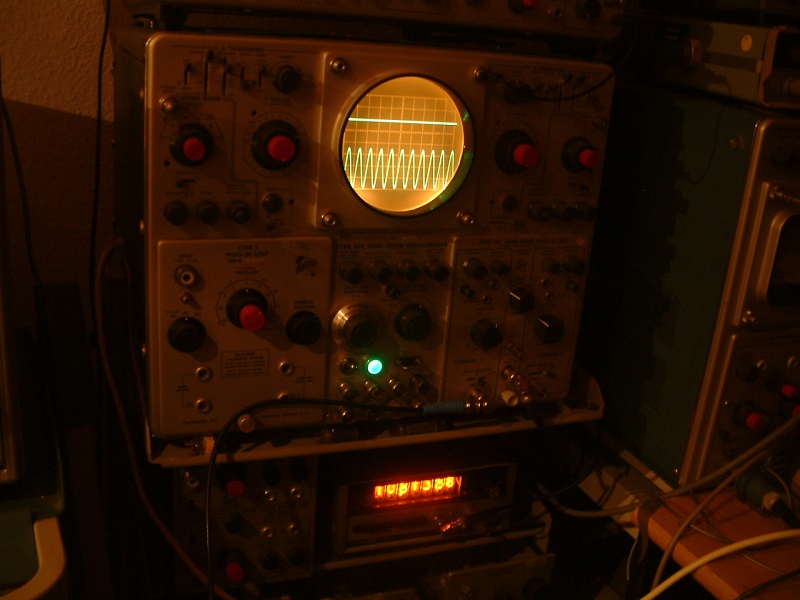 Messaufbau: Der Systron Donner nixiezähler hängt am Trig out CH1 vom 1A1 Einschub im Tek556. Das sind zwar 900 Wättchen und gute 50kg, es funktioniert aber klasse.