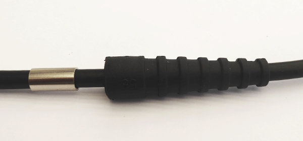 Damit es im Alltagsgebrauch weniger Stress auf die Verbindung gibt, ziehe ich nach der Montage und Kontrolle noch einen Schrumpfschlauf über das Kabel und den hinteren Teil des Steckers, eine Art Low-Cost-Knickschutz. Da der Schrumpfschlauch nicht über den Befestigungsring geht, muss man ihn bereits vor dem Zusammenbau des Steckers über das Kabel schieben.