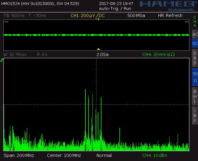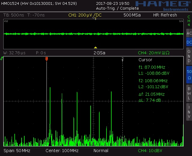die Empfindlichkeit ist bei der FFT-Darstellung eigentlich nie ein Problem, denn die FFT ist eine Filterfunktion, welche das Rauschen entsprechend der tatsächlichen Frequenzauflösung reduziert, während man im Zeitbereich das totale Rauschen der gesamten Bandbreite des Oszis sieht. Da die Rauschleistung proportional zur Bandbreite ist, bedeutet eine Reduzierung der Bandbreite auf 1/10 eine Rauschreduktion um 10dB. Hat man z.B. in der FFT eine Frequenz-Schrittweite von 15kHz, wird die Bandbreite in diesem Fall von 150kHz auf 15kHz reduziert, was ein Faktor 10000 oder 40dB ist. In Spannung ausgedrückt heisst das, dass das Rauschband vom Zeitbereich (beim Hameg etwa 100uV) in der FFT 40dB oder ein Faktor 100 reduziert wird, also die Empfindlichkeit auf 1uV erhöht wird. Bei konstanten Verhältnissen kann man auch mehrere FFTs mitteln, das reduziert das Rauschen nochmals beträchtlich, aber die Messung dauert entsprechend länger.