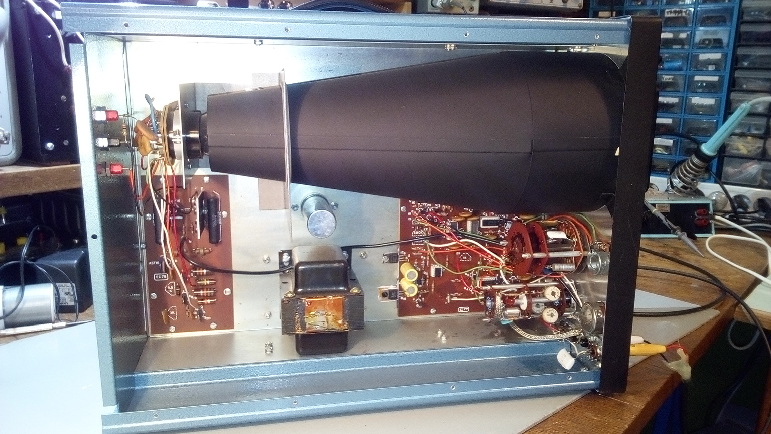 Im Manual ist eine Liste mit sämtlichen Spannungen an den Transistoren und ICs, was die Fehlersuche vereinfacht. Oszis habe ich genug, um die Ablenkspannungen zu überprüfen.