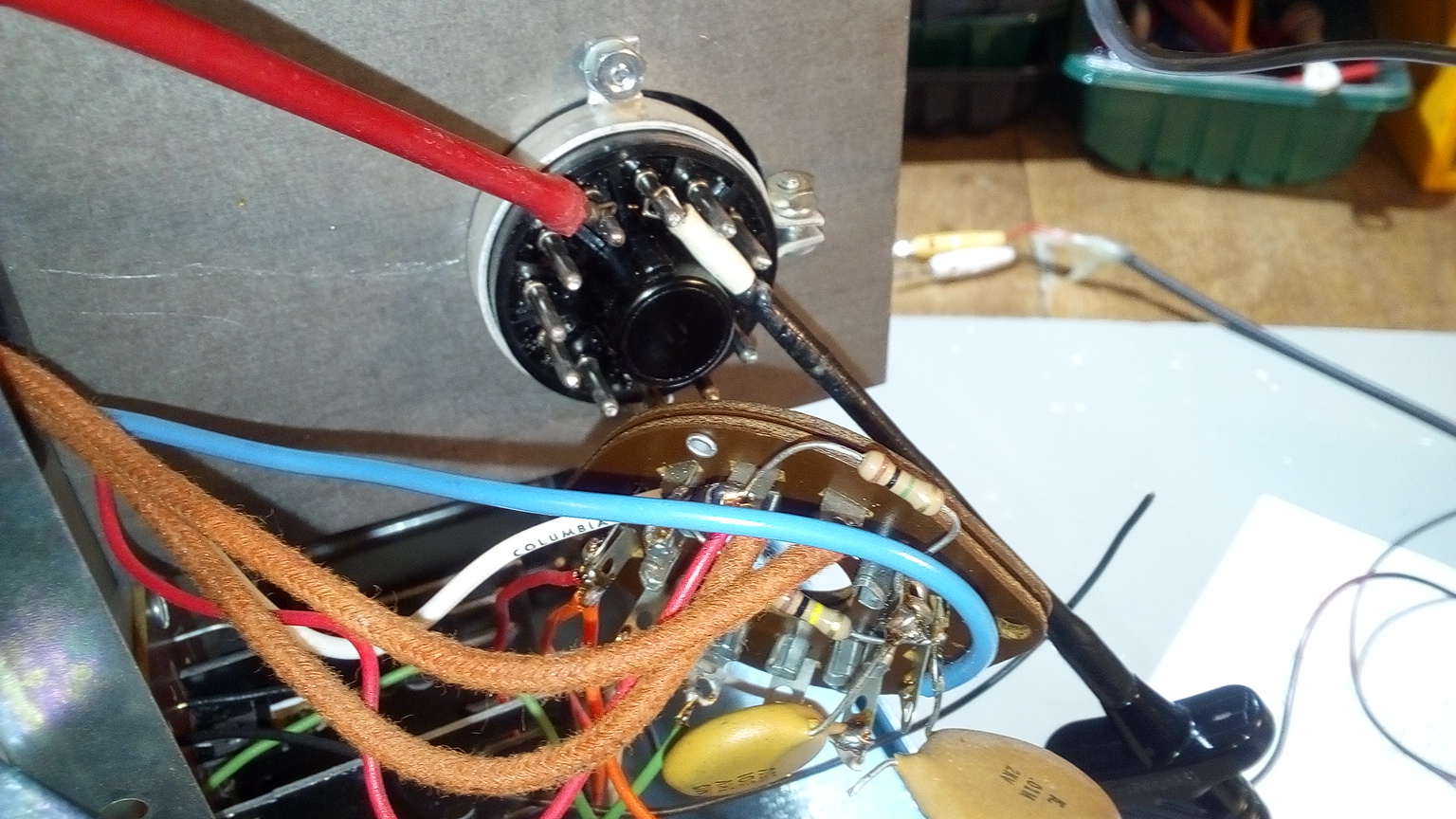 Der Fehler lässt sich auch durch leichtes Klopfen auf den Röhrenhals auslösen. Hoffentlich ist es nicht die Röhre selbst. Ich könnte die Stifte des Sockels mit dem Lötkolben erhitzen, um sie nachzulöten.